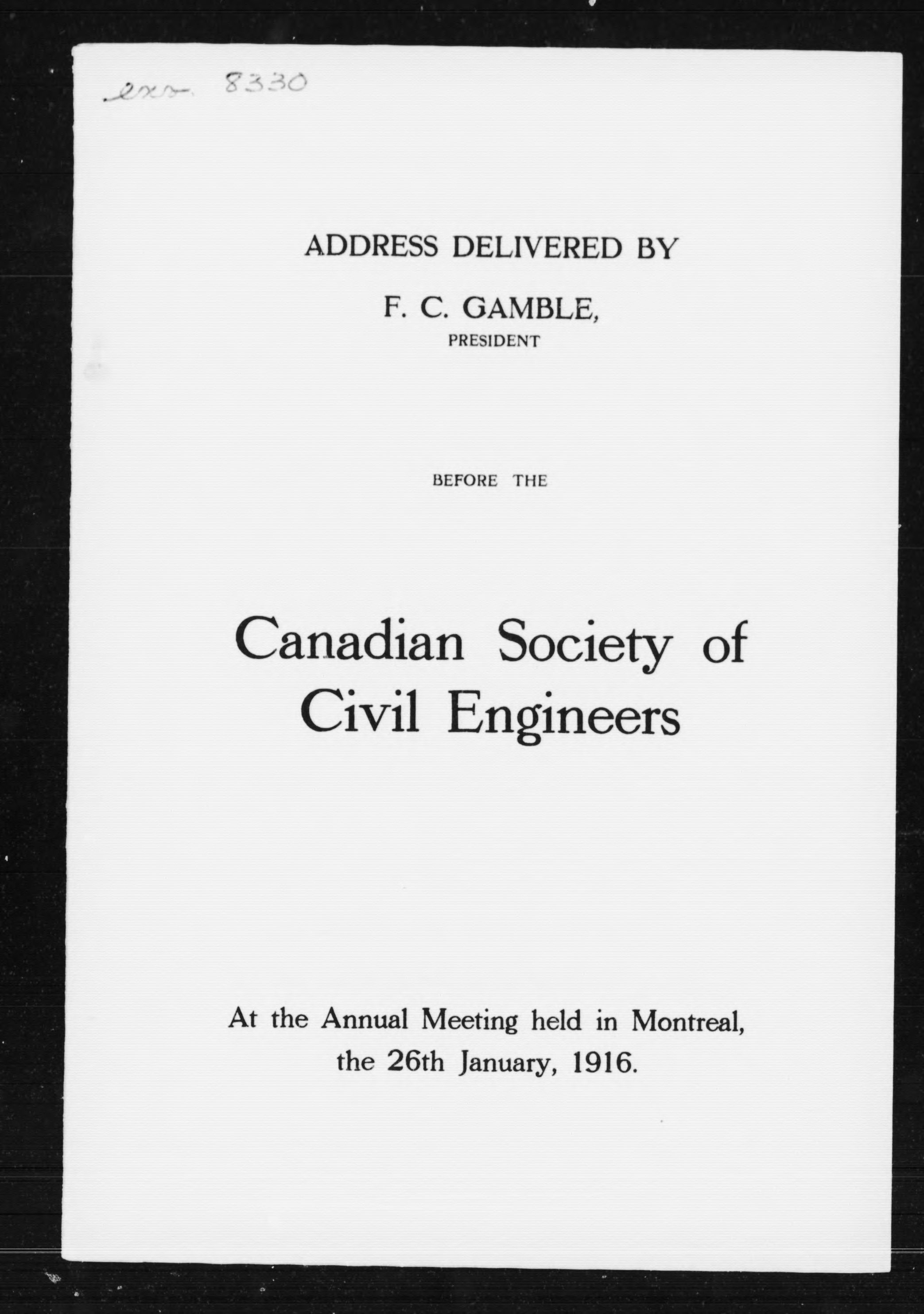 Address delivered by F.C. Gamble, president, before the Canadian Society of Civil Engineers, at the annual meeting held in Montreal, the 26th January 1916 .