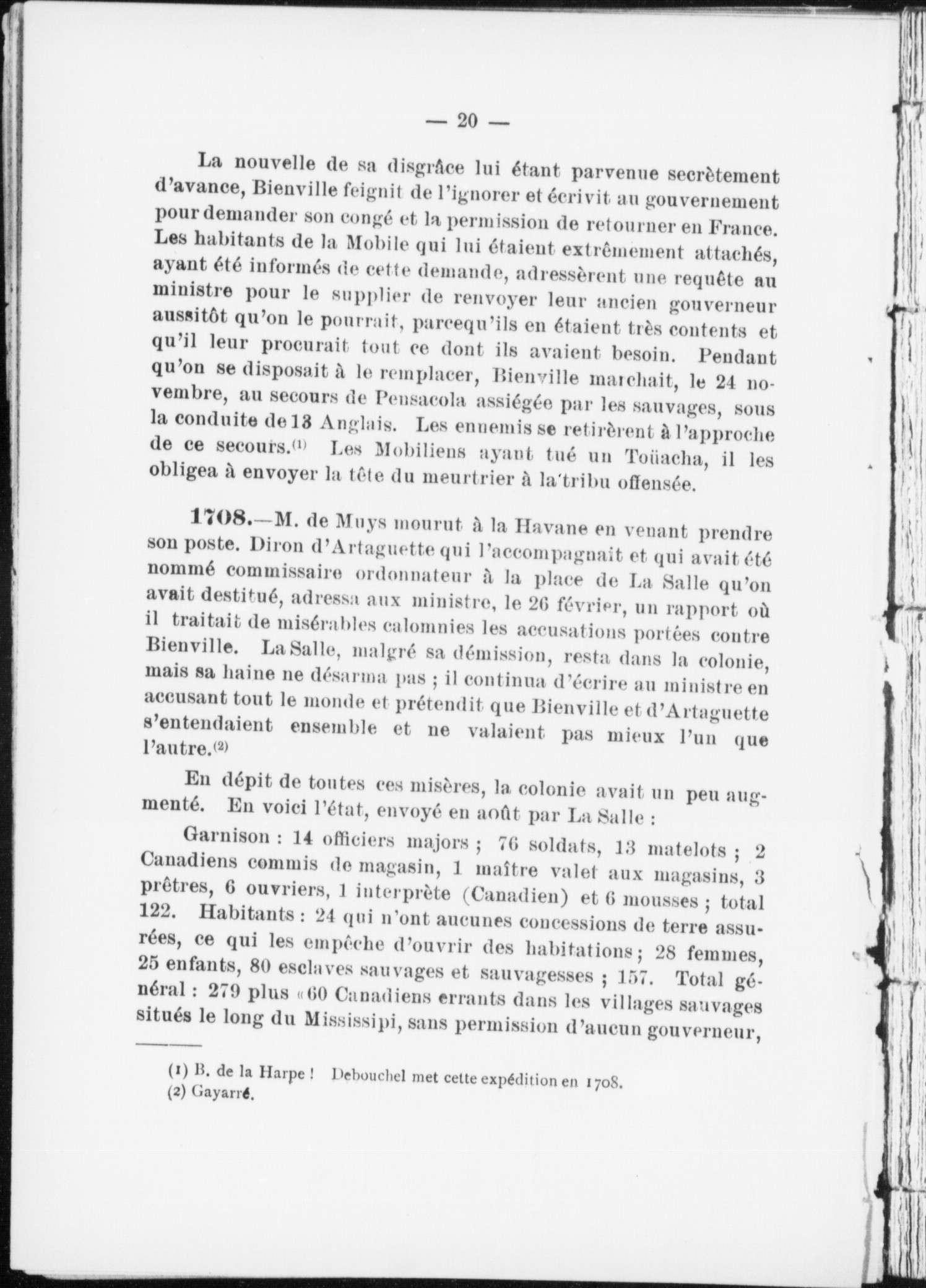 - De la fondation à l'administration de Crozat, 1699-1712 : Administration de Crozat, 1712-1718 ; De la nomination de Bienville comme gouverneur de la Louisiane jusqu'à son rappel, 1718-1726 ; Du rappel de Bienville à la Louisiane jusqu'à sa mort, 1733-1767