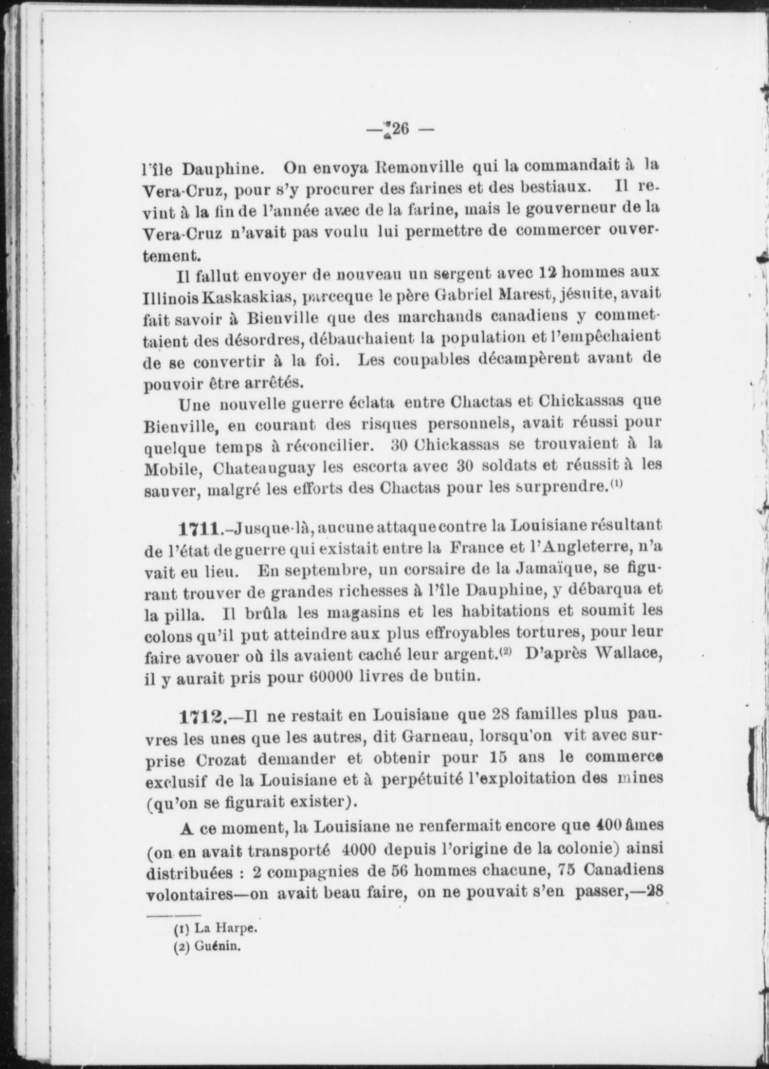 - De la fondation à l'administration de Crozat, 1699-1712 : Administration de Crozat, 1712-1718 ; De la nomination de Bienville comme gouverneur de la Louisiane jusqu'à son rappel, 1718-1726 ; Du rappel de Bienville à la Louisiane jusqu'à sa mort, 1733-1767