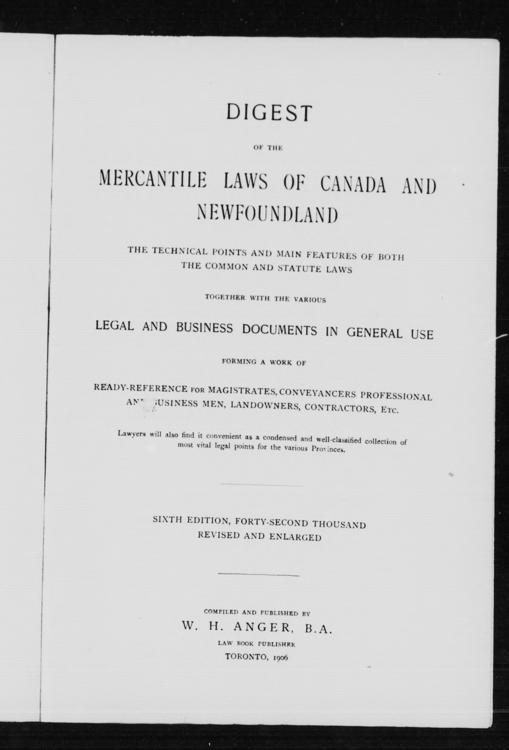 Digest of the mercantile laws of Canada and Newfoundland : the technical points and main features of both the common and statute laws together with the various legal and business documents in general use ... - Adresse bibliographique