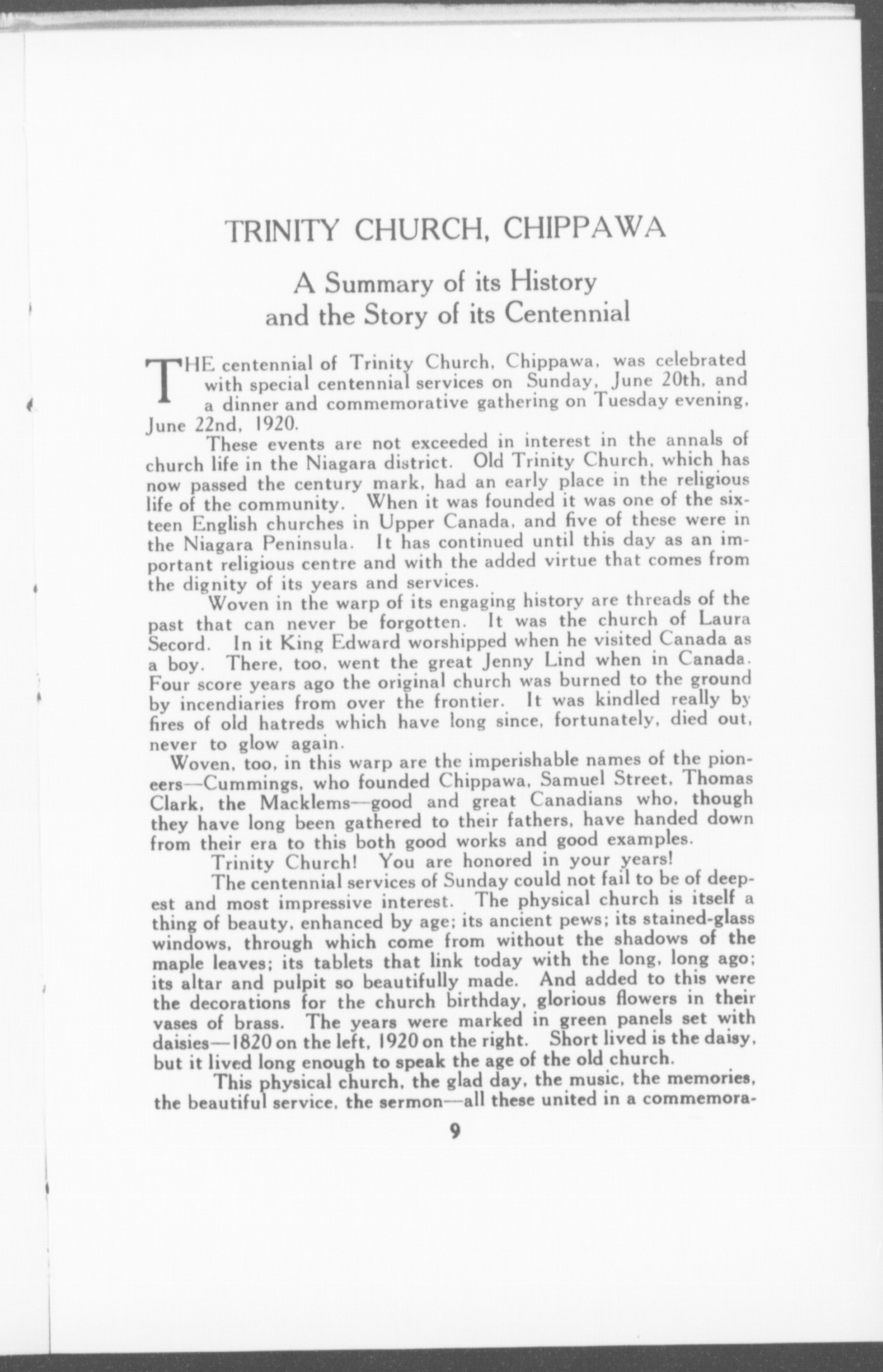 Hundredth anniversary of Trinity Church, Chippawa : A story of the Centennial Ceremonies and the History of the Church the past century, 1820-1920