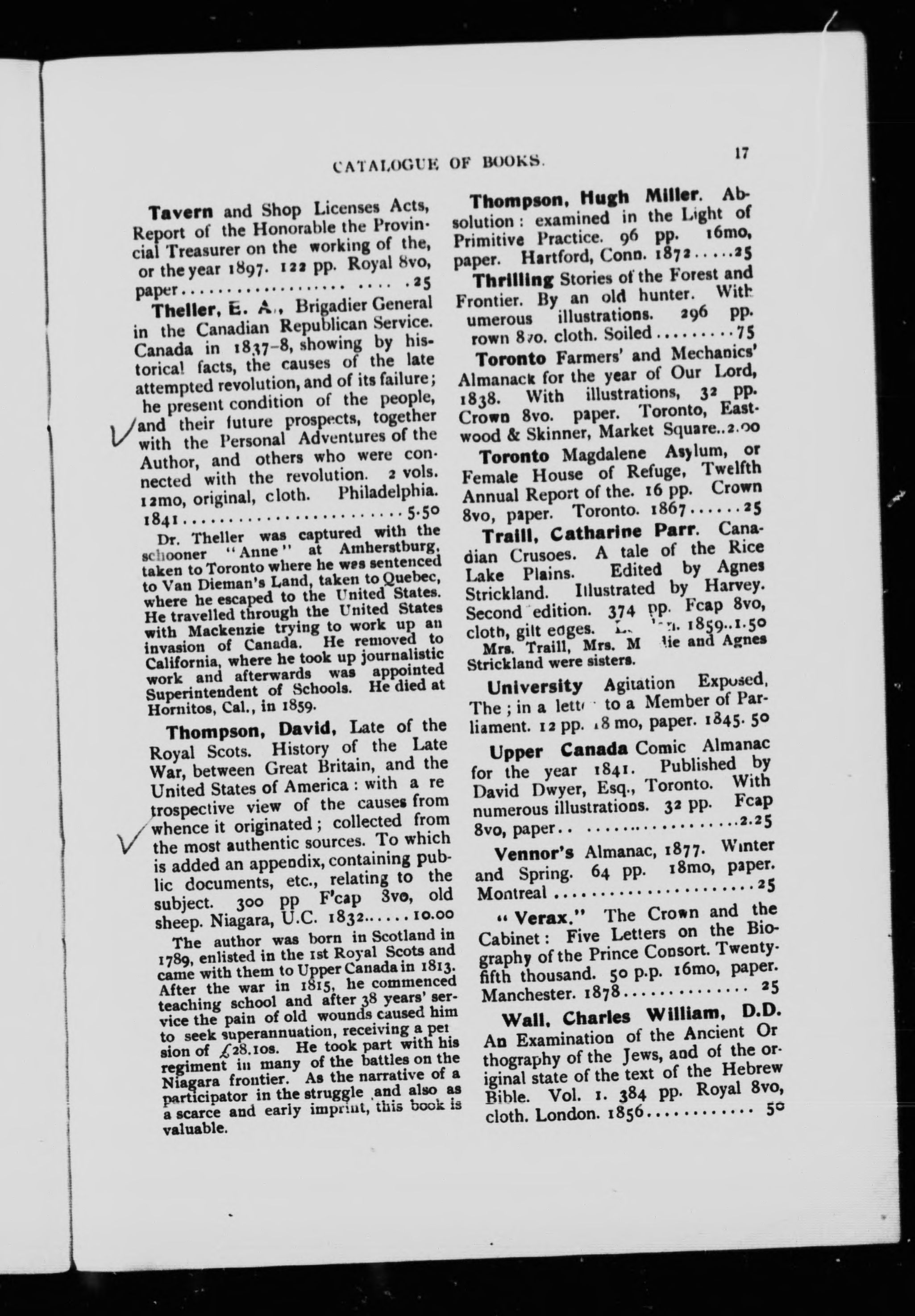 Catalogue of an important collection of Canadian, American and general books, scarce pamphlets, scarce local histories, Gourlay's Upper Canada - 3 vols., Dent's Last forty years, Canniff's Upper Canada, Thompson's War of 1812, Indian treaties and surrenders, Ross' Red River Settlement, McQueen's Narrative, Richardson's War of 1812, Doughty's Siege of Quebec and Battle of the Plains of Abraham