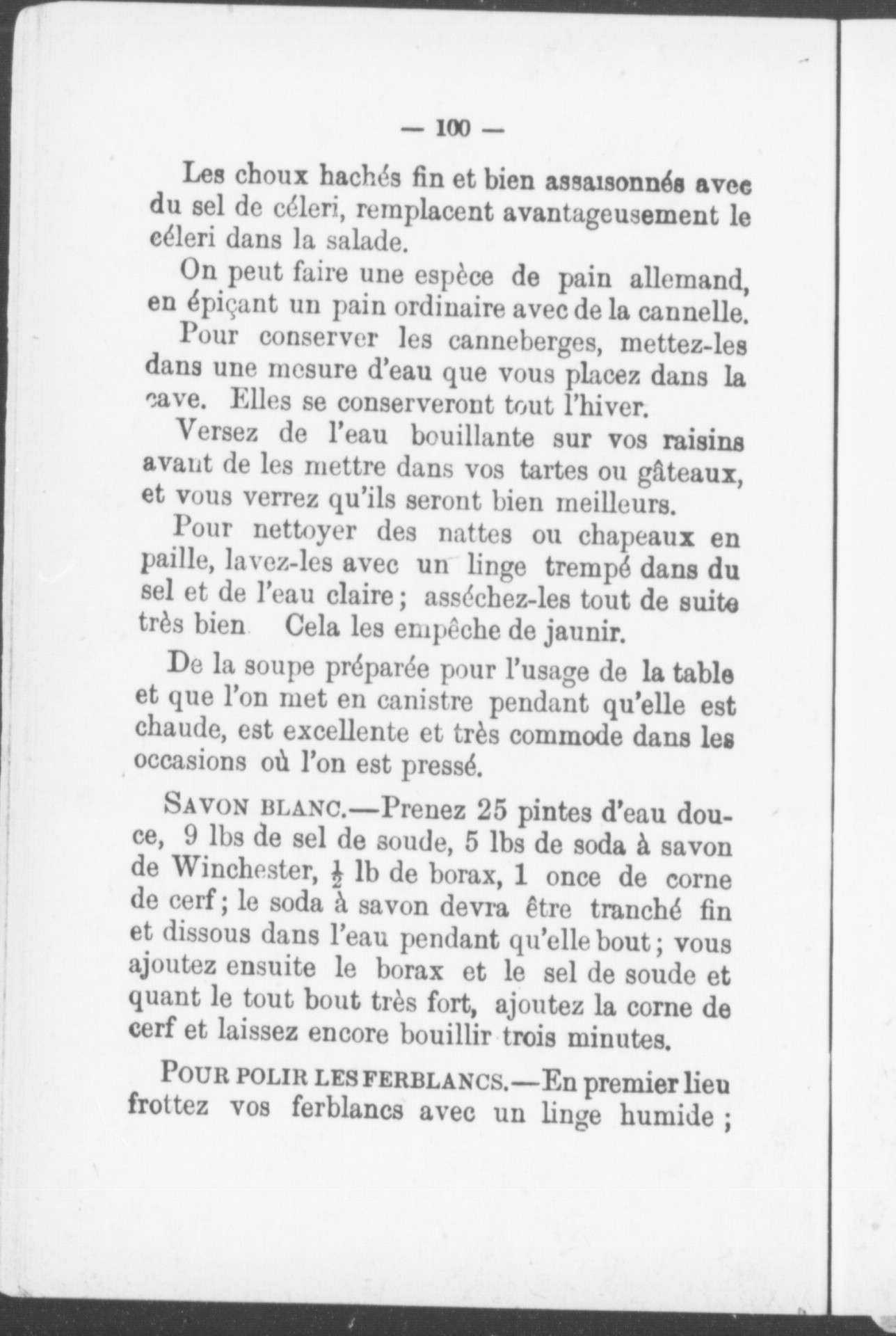 - La cuisinière des familles : contenant les recettes les plus pratiques et les plus simples pour préparer les potages, viandes et poisson; oeufs et salades, légumes, marinades; pâtisseries, gelées, fruits, sauces, conserves, breuvages divers, etc., etc., ainsi que plusieurs conseils très utiles dans un ménage.