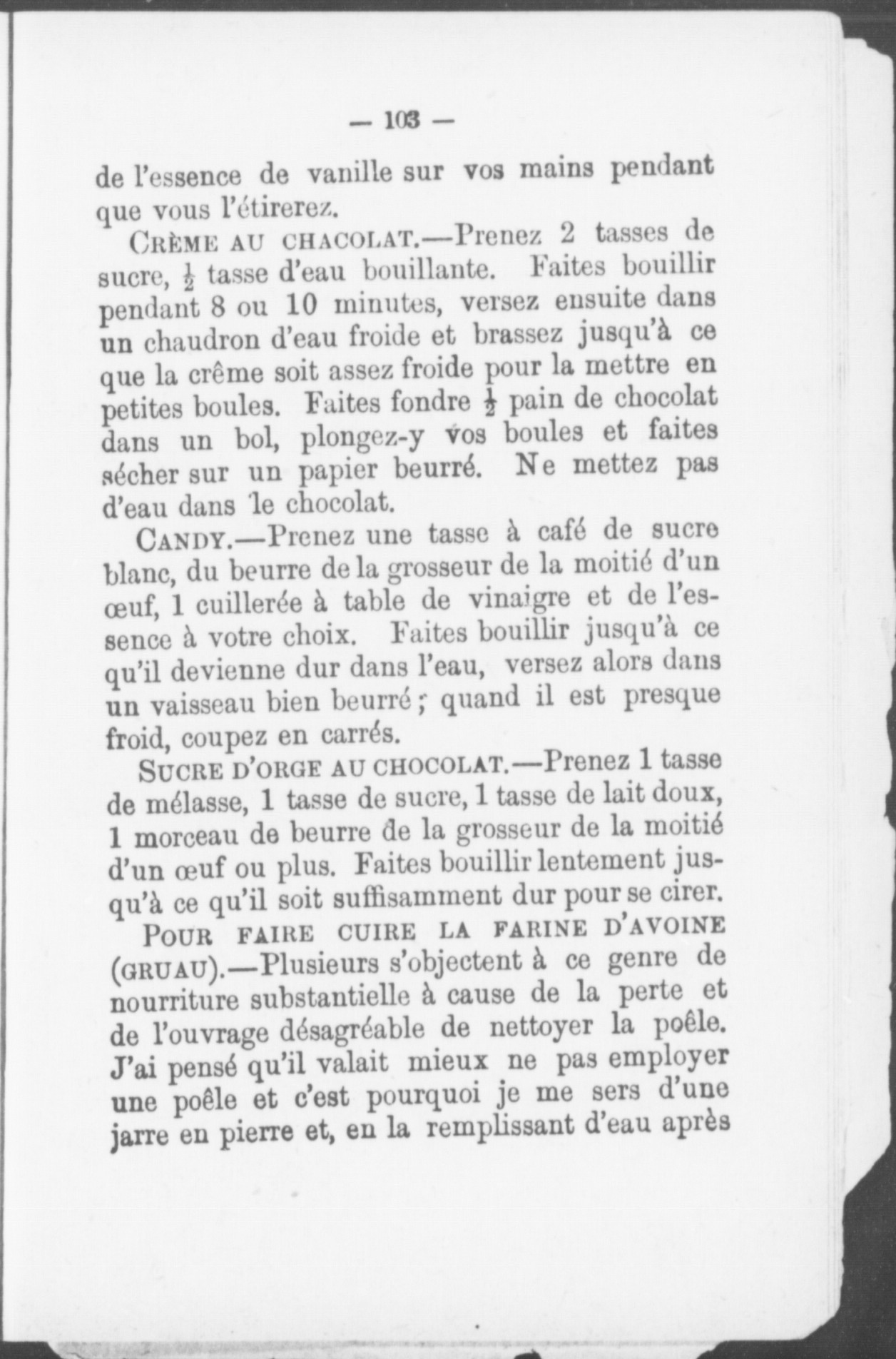 - La cuisinière des familles : contenant les recettes les plus pratiques et les plus simples pour préparer les potages, viandes et poisson; oeufs et salades, légumes, marinades; pâtisseries, gelées, fruits, sauces, conserves, breuvages divers, etc., etc., ainsi que plusieurs conseils très utiles dans un ménage.