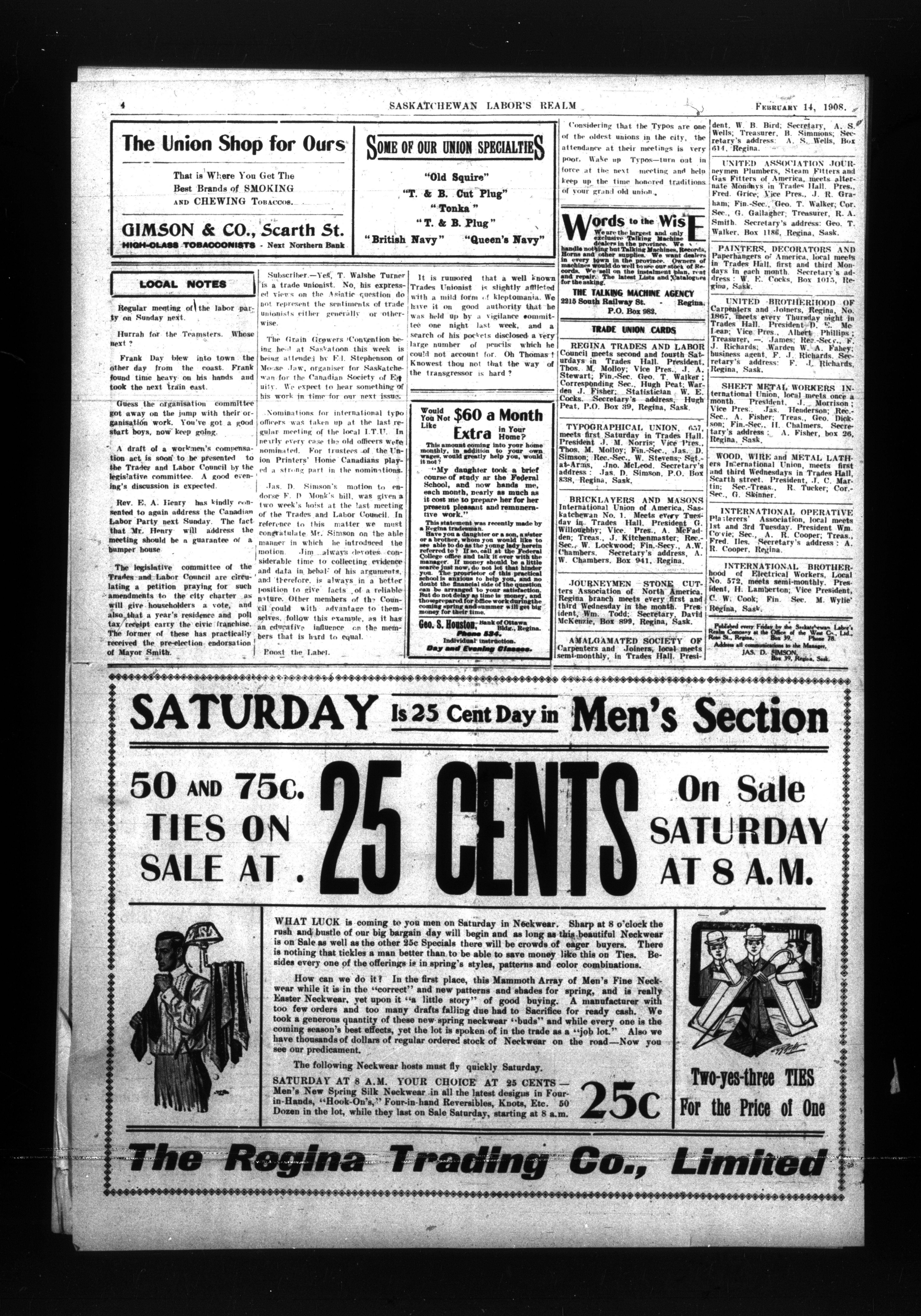 Saskatchewan Labor's Realm. : Saskatchewan Labor's Realm : Vol. 1, No. 32 (February 14, 1908)