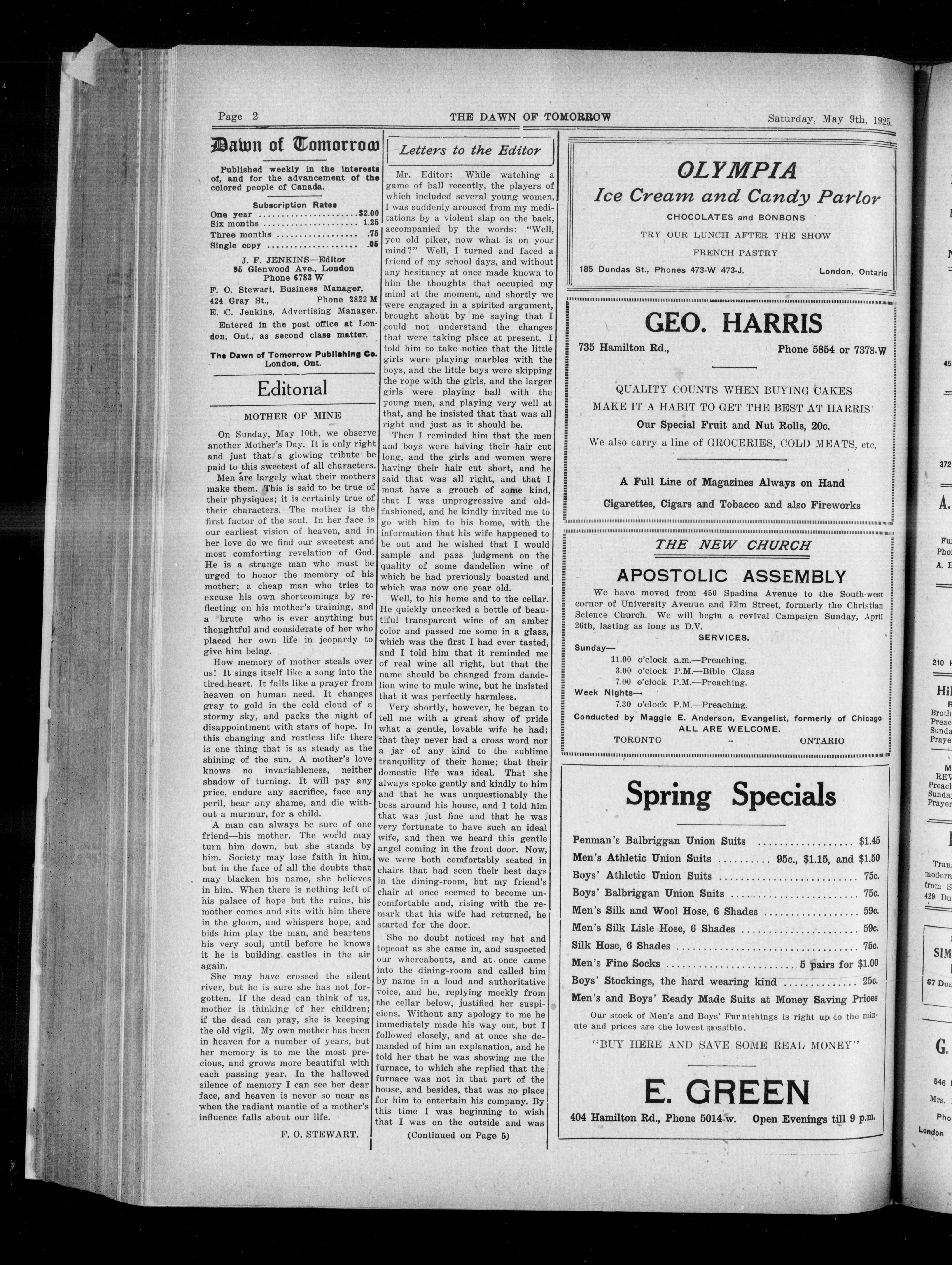 London, Ontario: The Dawn of Tomorrow Publishing Co., [1925]