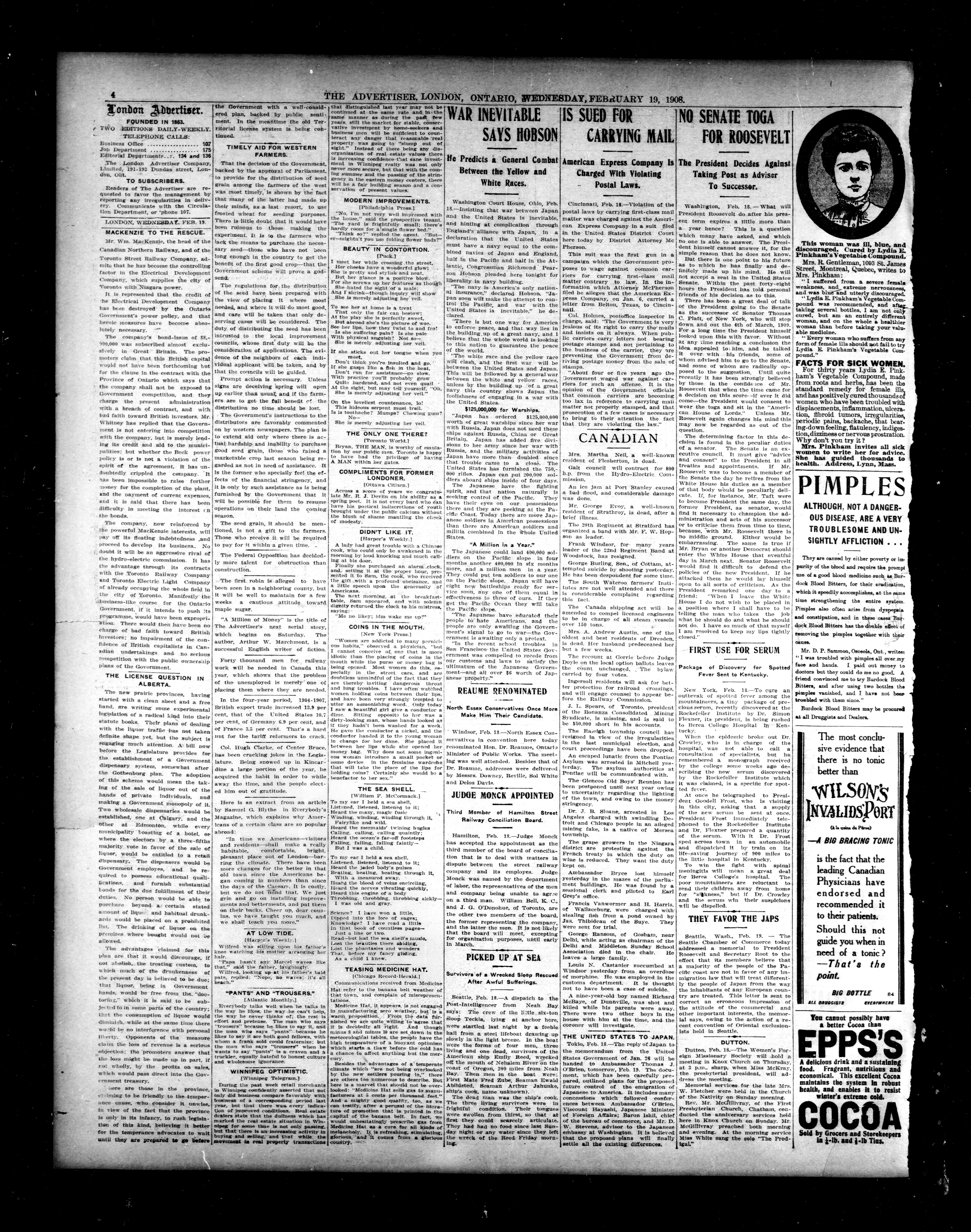 - London Advertiser : 44th Year, No. 19280 (February 19, 1908)