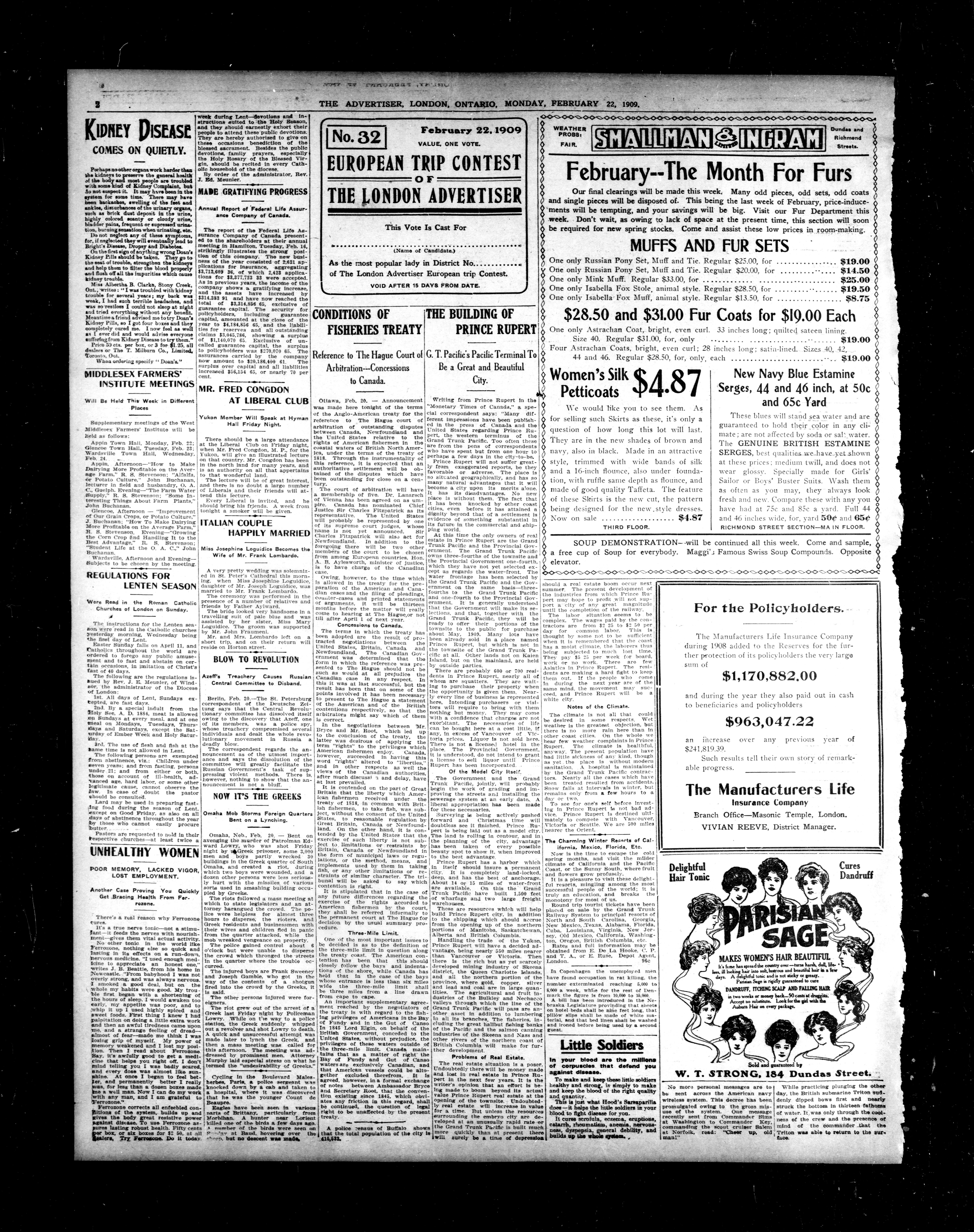 London advertiser. : London Advertiser : 46th Year, No. 19596 (February 22, 1909)