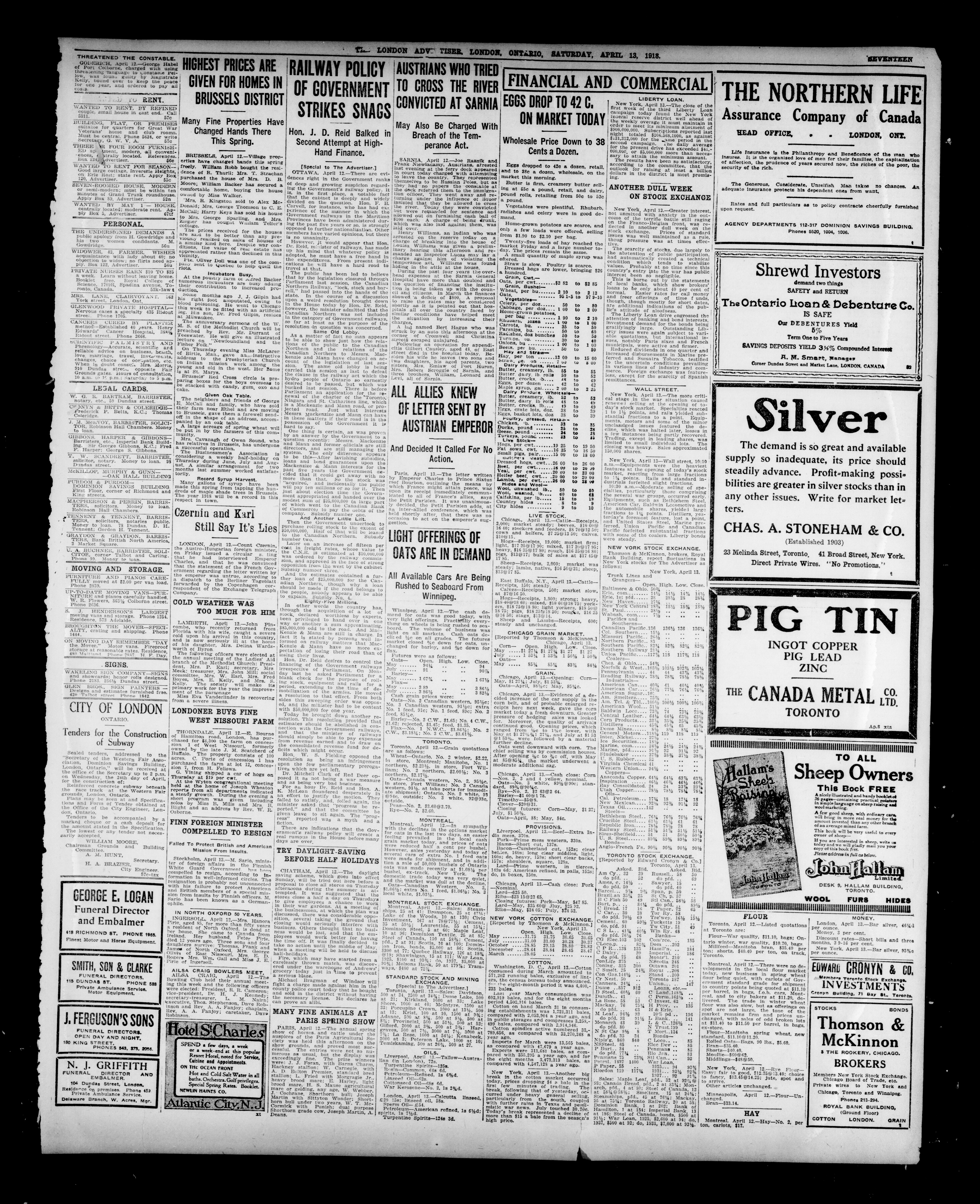 - The London Advertiser : 55th Year, No. 22057 (April 13, 1918)