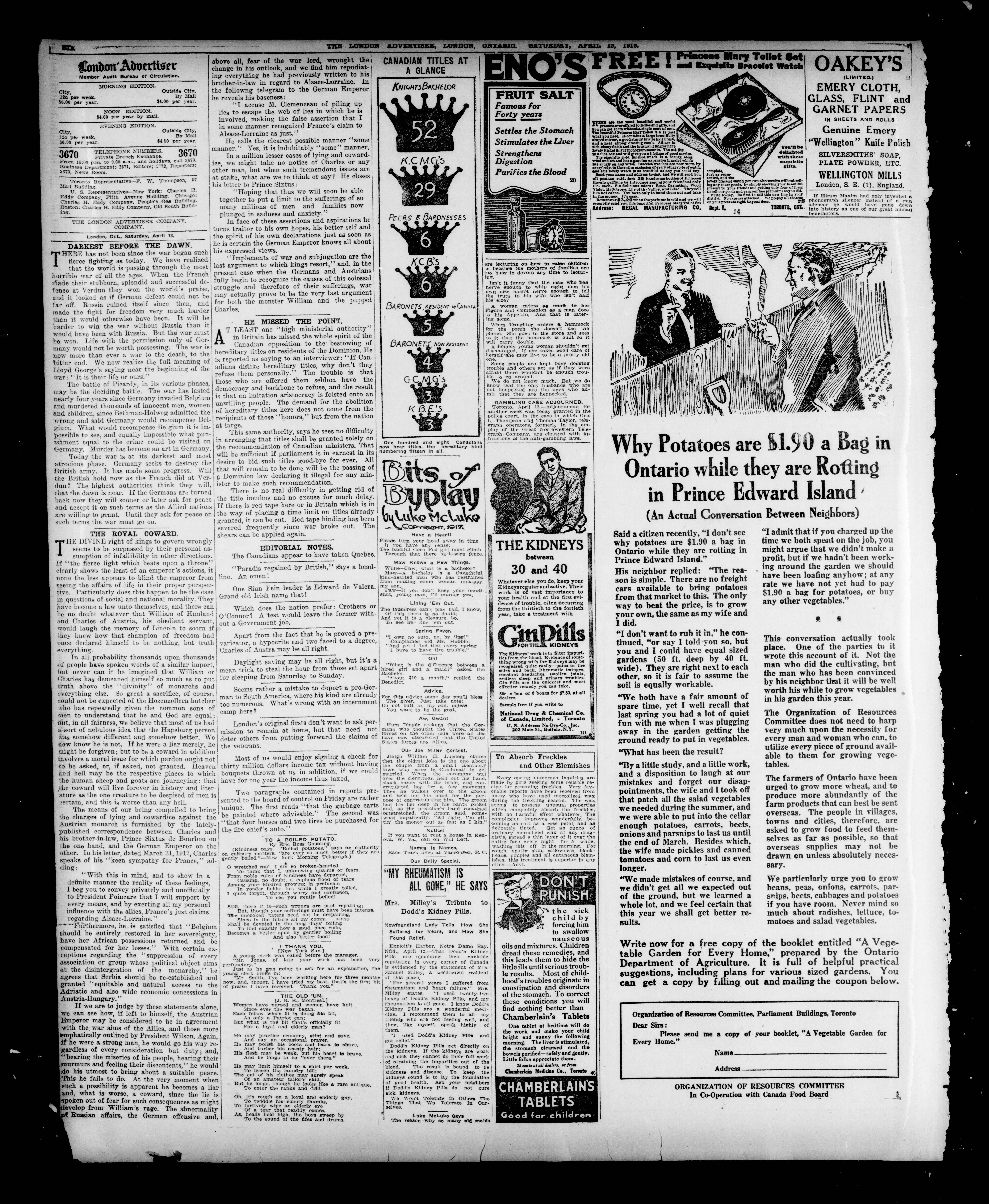 - The London Advertiser : 55th Year, No. 22057 (April 13, 1918)