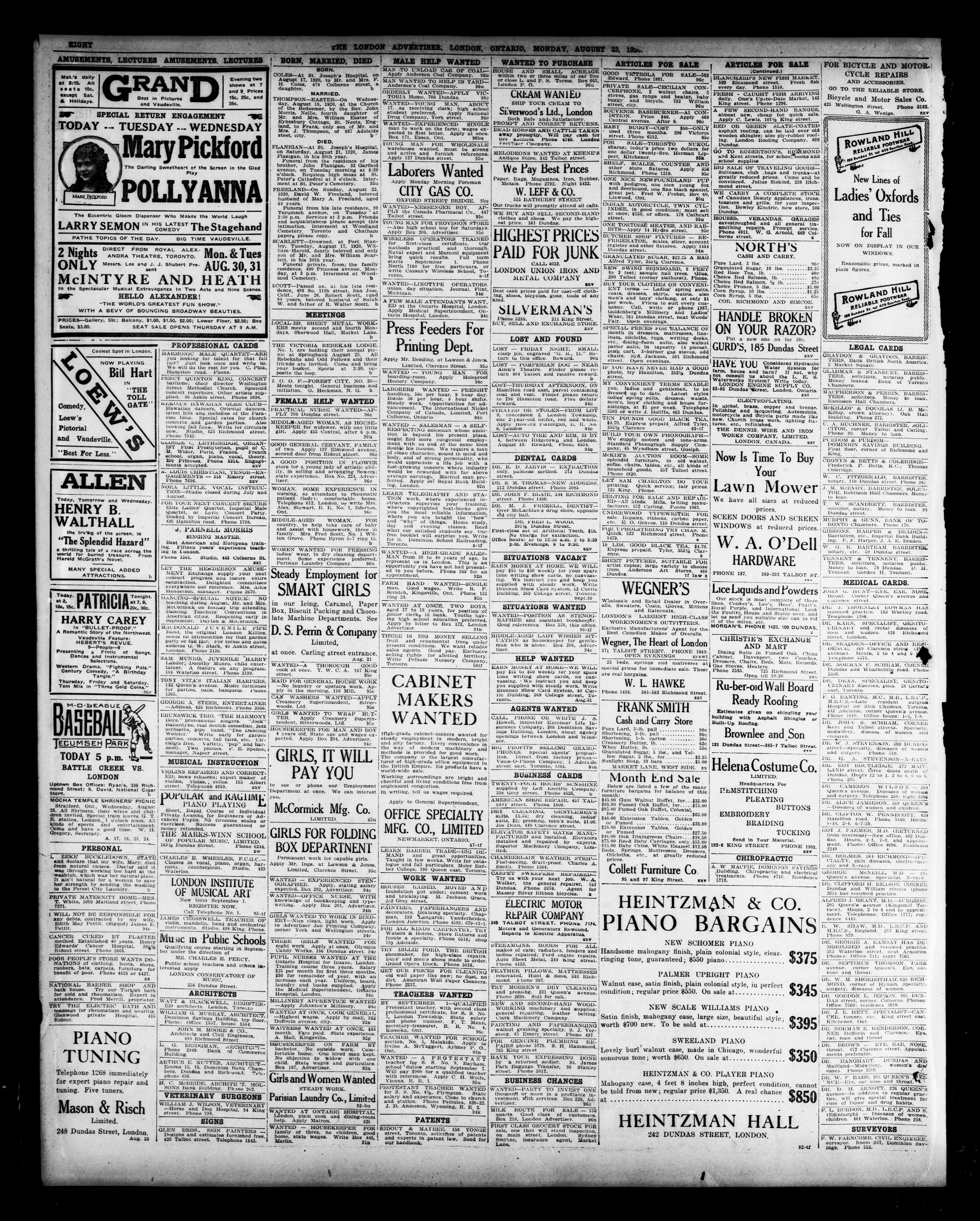 London advertiser. : The London Advertiser : 57th Year, No. 22796 (August 23, 1920)