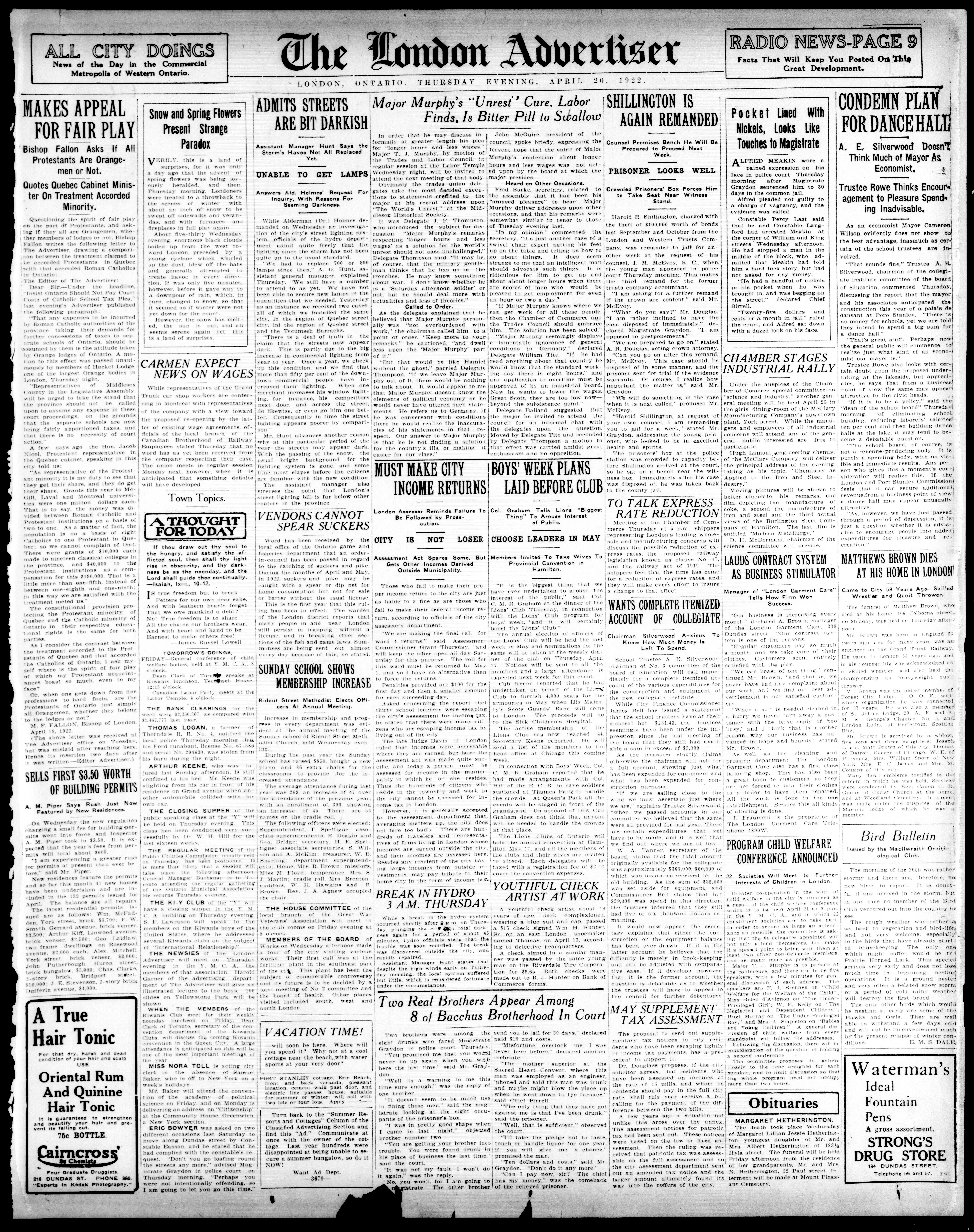 London advertiser. : The London Advertiser : 59th Year, No. 23315 (April 20, 1922)