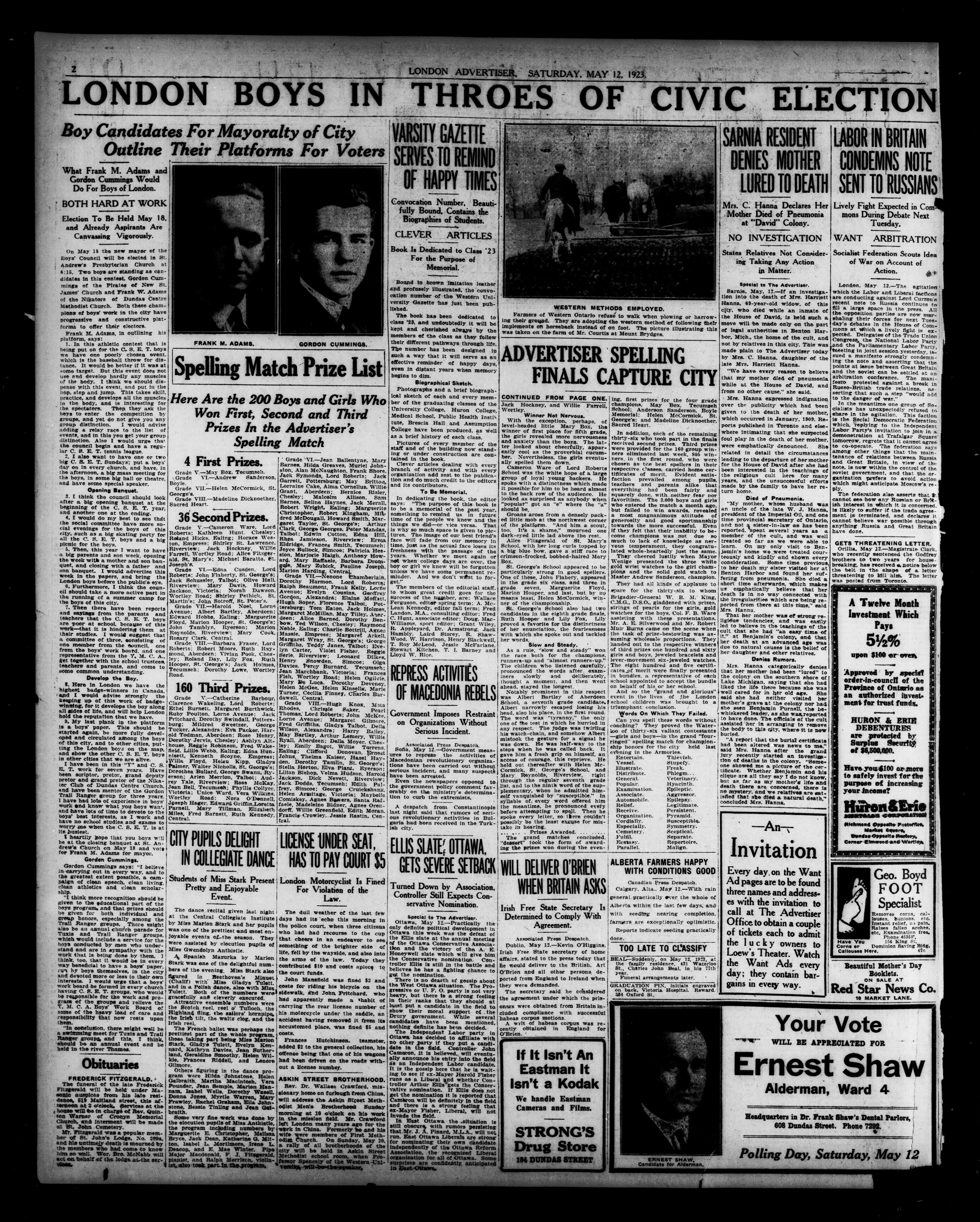 London Evening Advertiser. : London Evening Advertiser : 60th Year, No. 23647 (May 12, 1923)