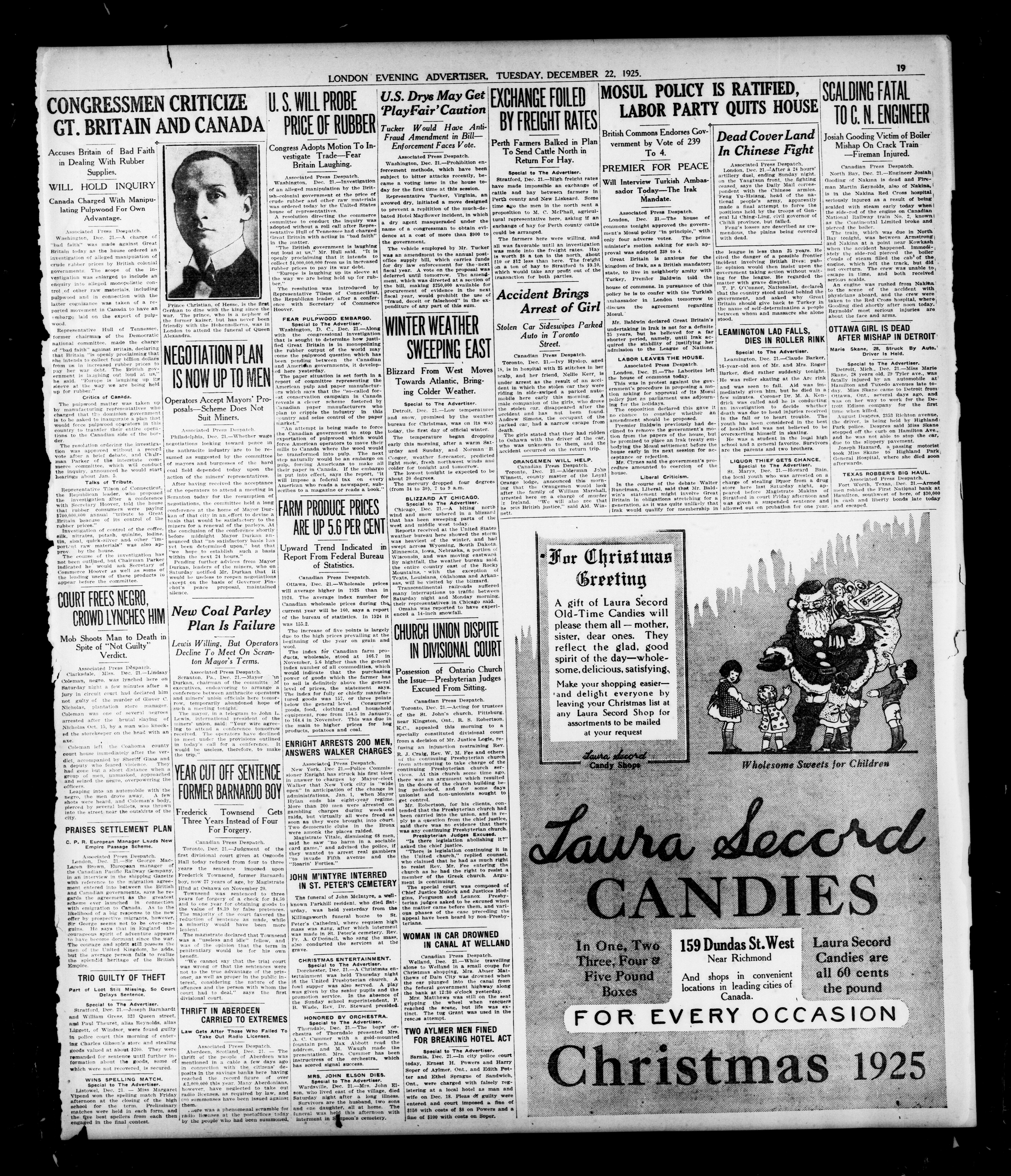 London Evening Advertiser. : London Evening Advertiser : 62nd Year, No. 24465 (December 22, 1925)
