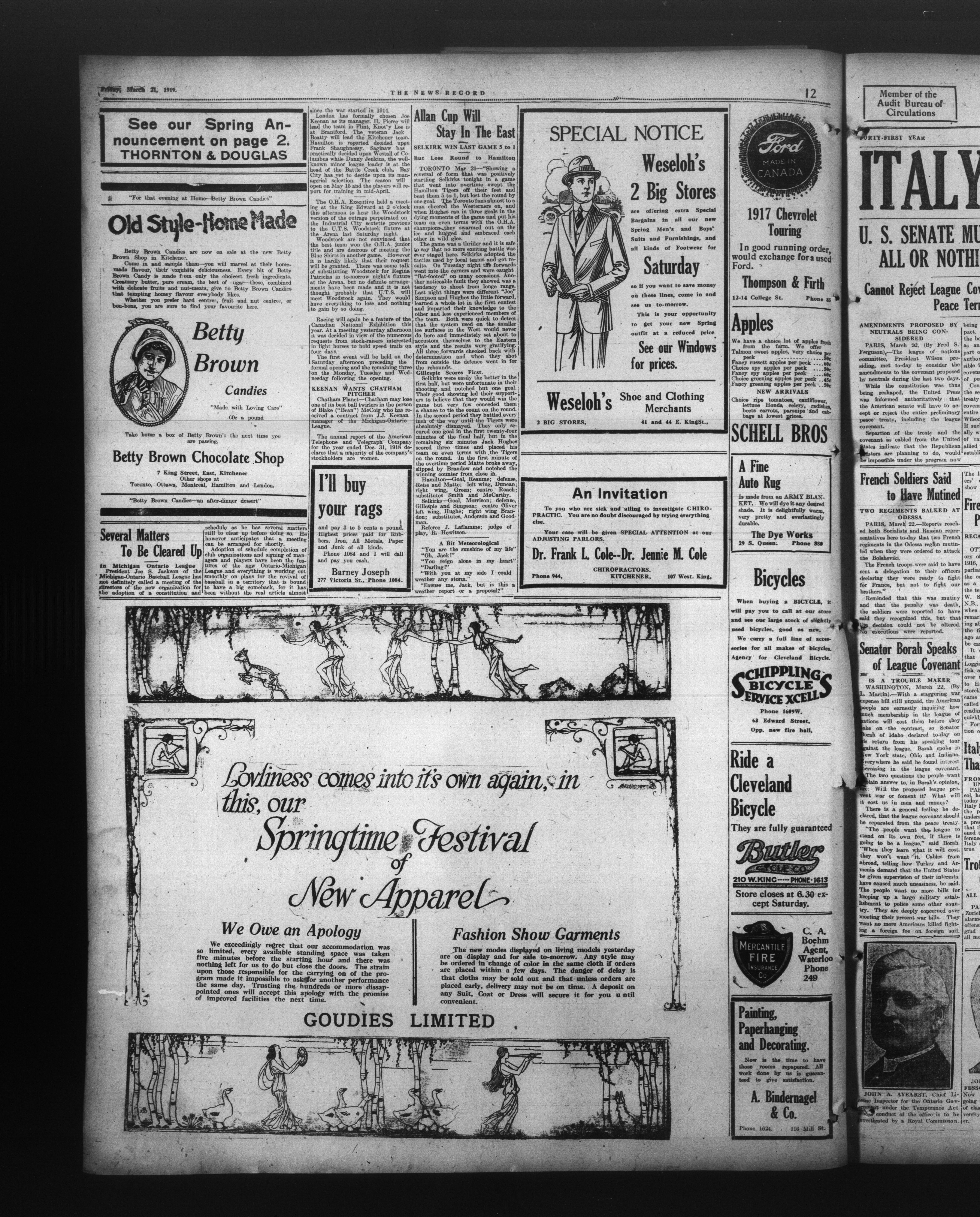 Kitchener, Ontario : The News Record Limited, [1919]; 12 images avec recherche en texte intégral