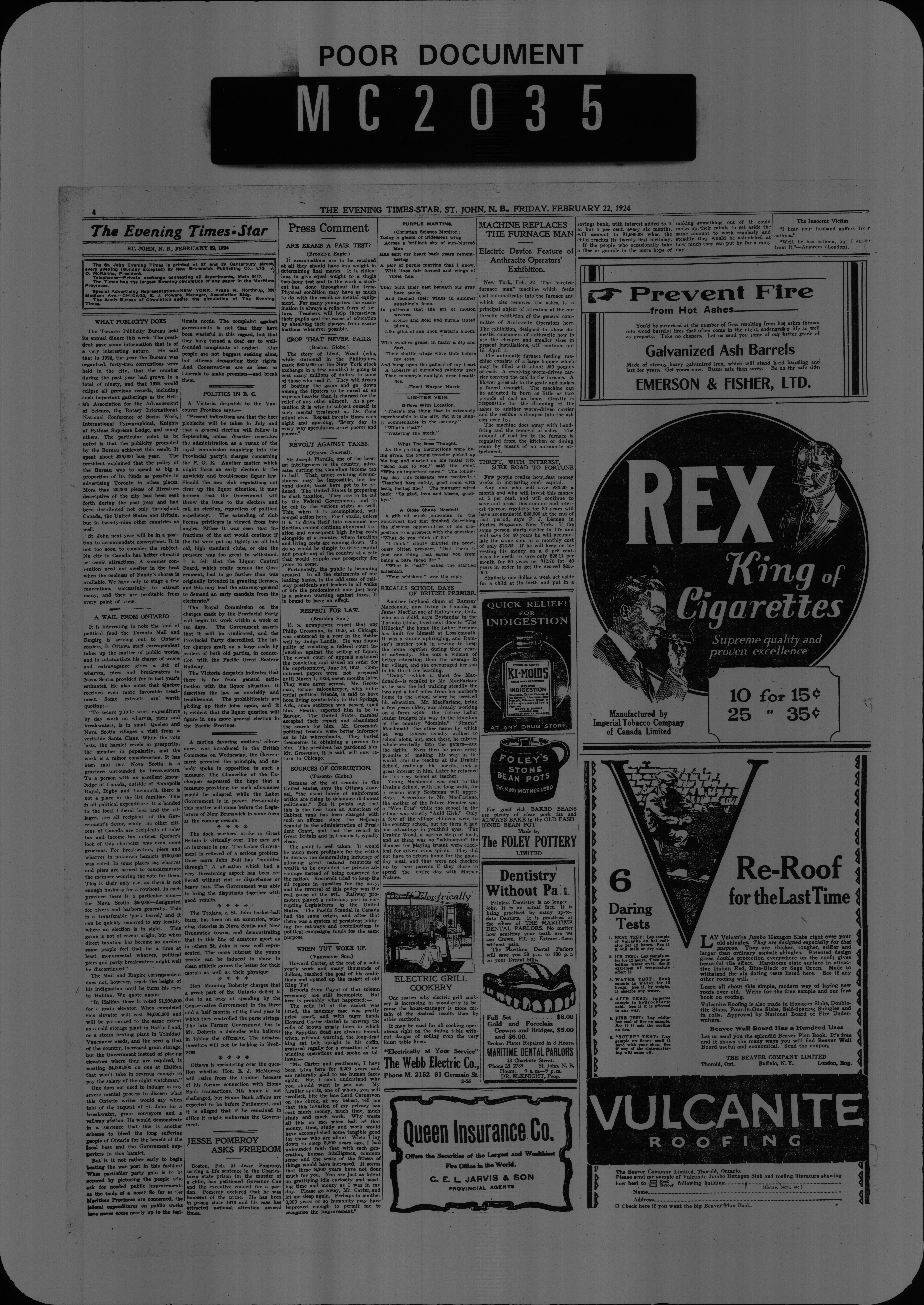 The Evening times star : Vol. XX, No. 122 (February 22, 1924)