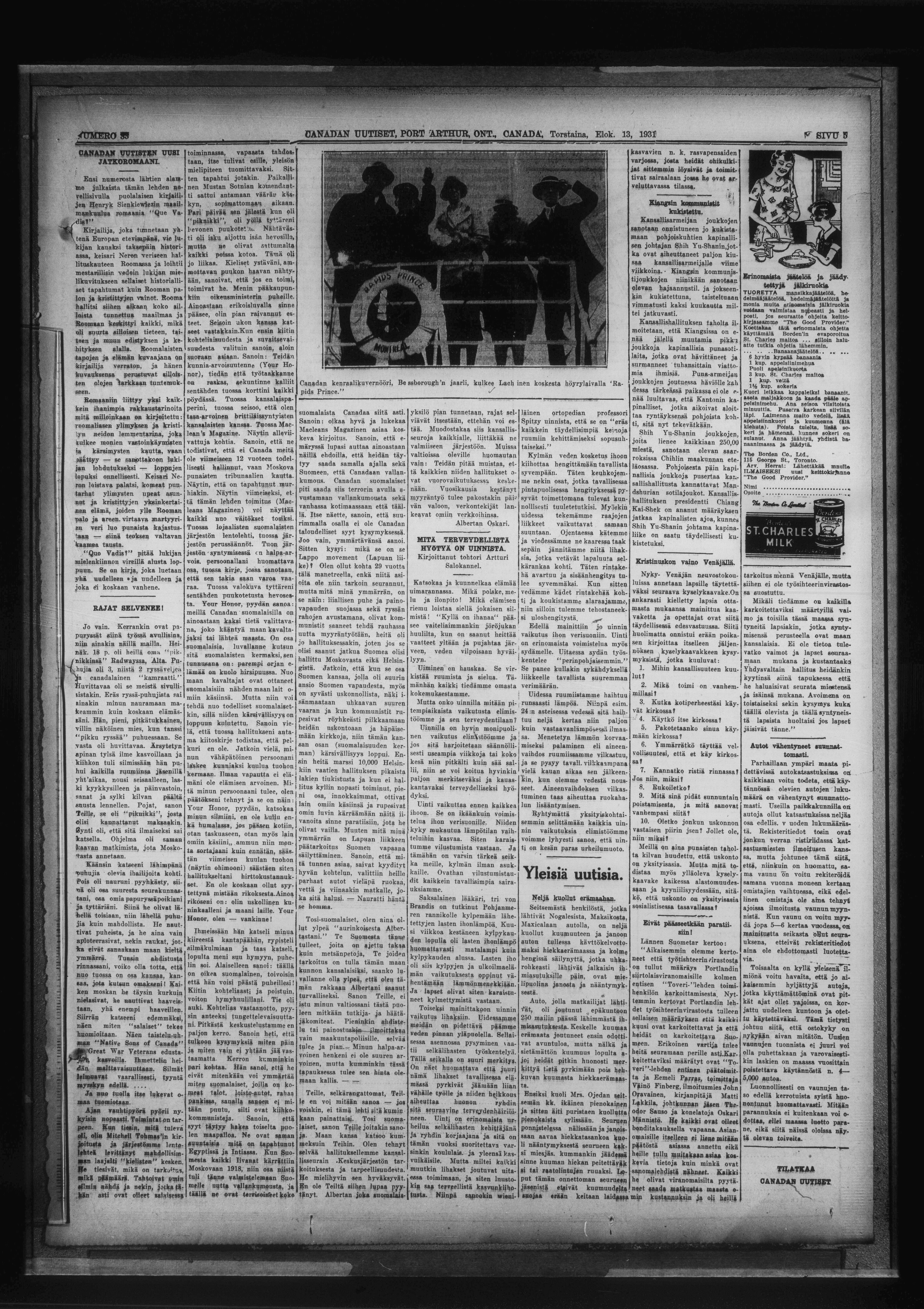 Canadan uutiset : XVII Vuosik = Vol. XVII, Numero 33 (Elok. 13, 1931 = August 13, 1931)