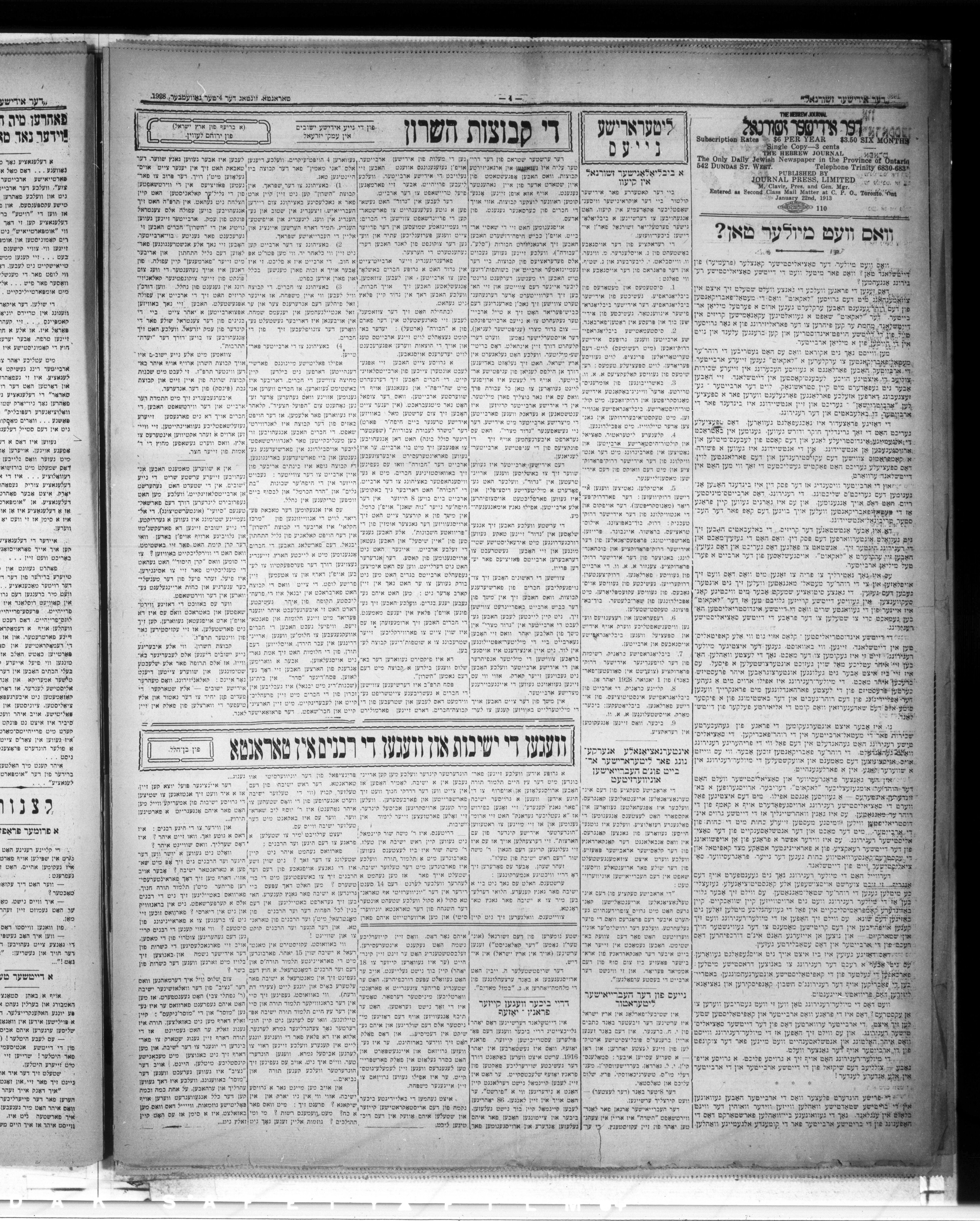 Der Yidisher zhurnal = The daily Hebrew journal : Volume XV, No. 6274 (November 4, 1928)