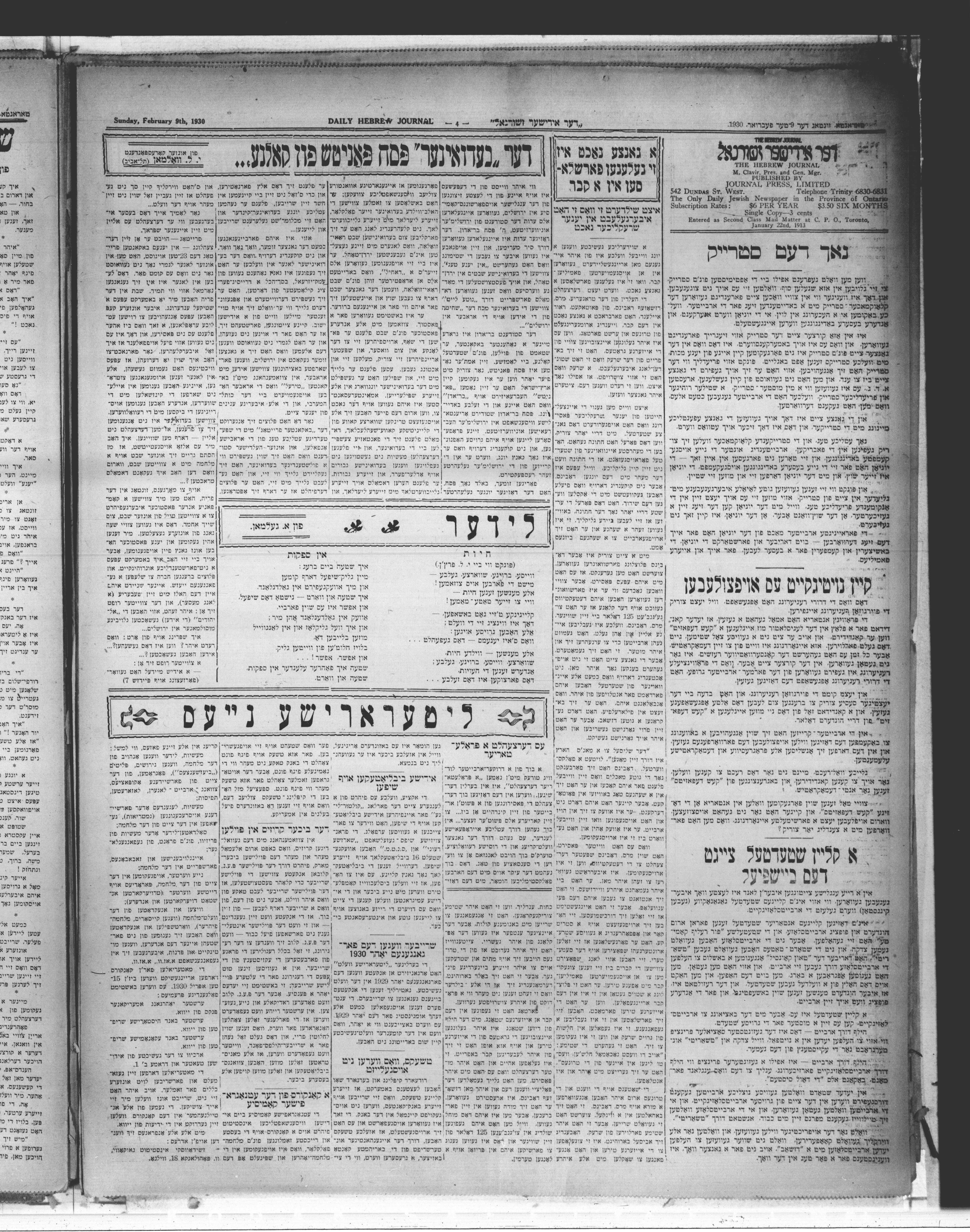 Der Yidisher zhurnal = : Der Yidisher zhurnal = The daily Hebrew journal : Volume XVII, No. 7234 (February 9, 1930)