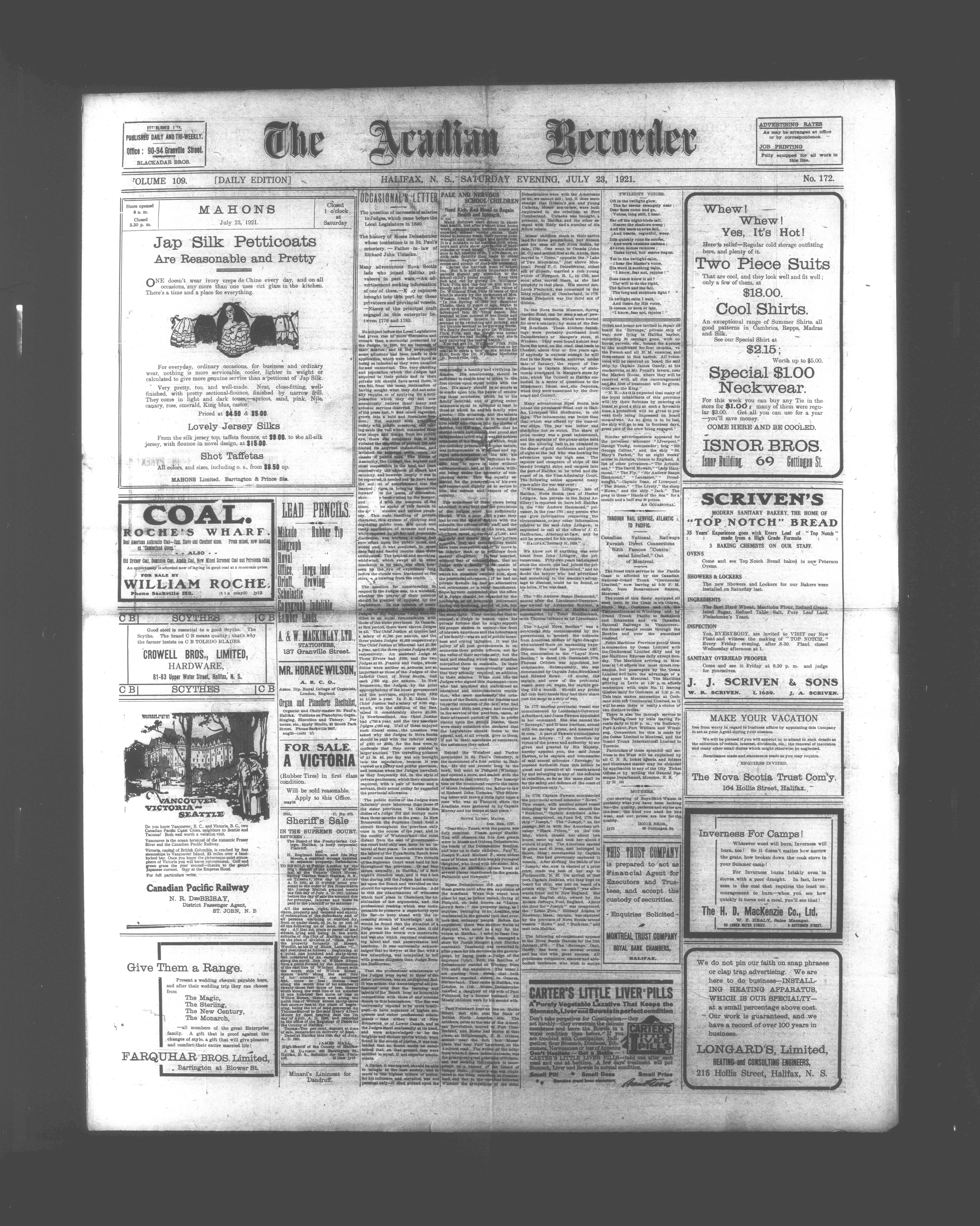 The Acadian recorder : Volume 109, No. 172 (July 23, 1921)