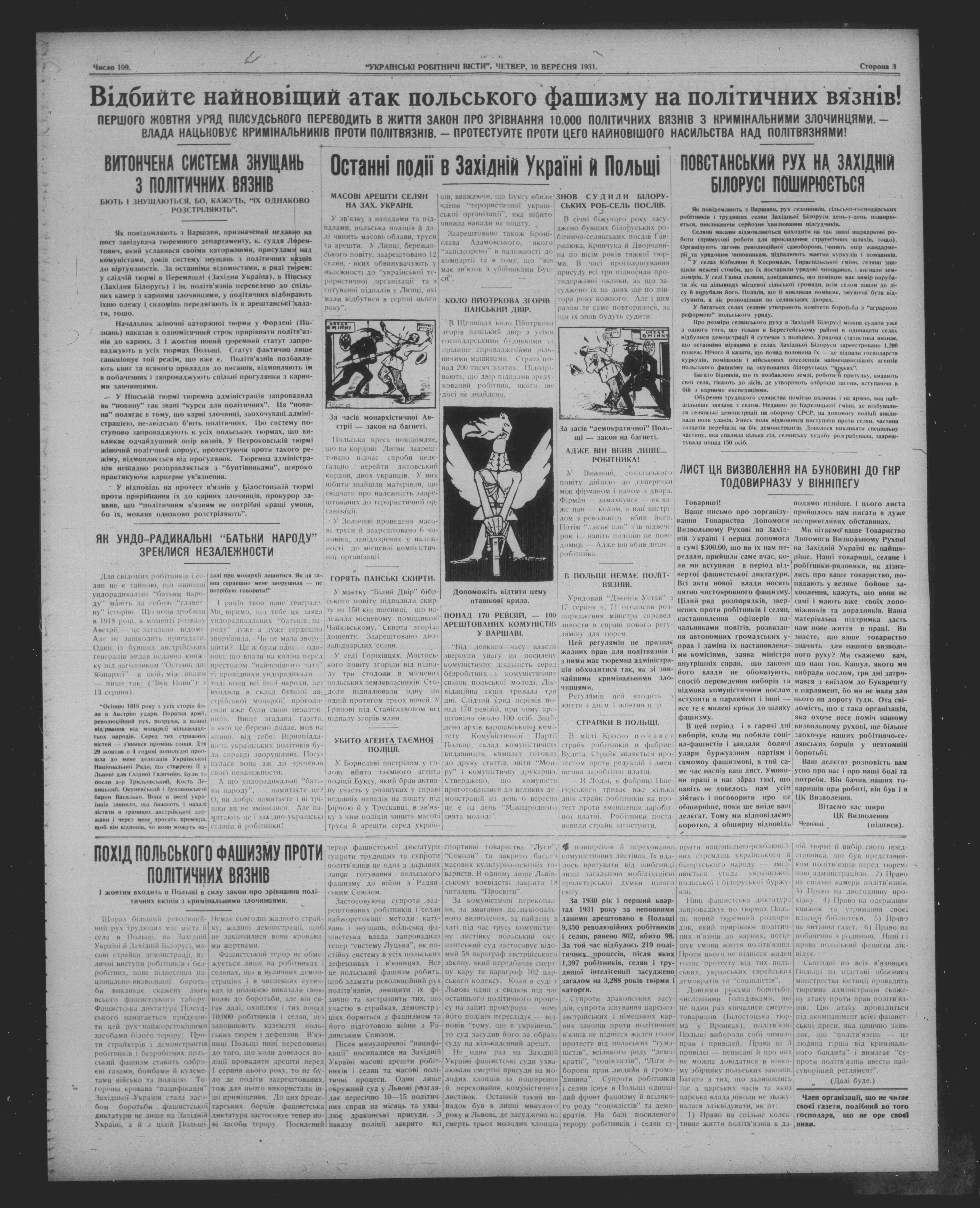 Ukraïnski robitnychi visty = Ukrainian labor news : Rik XIII, Ch. 109 (10 Veresnia, 1931) = Vol. XIII, No. 109 (September 10, 1931)