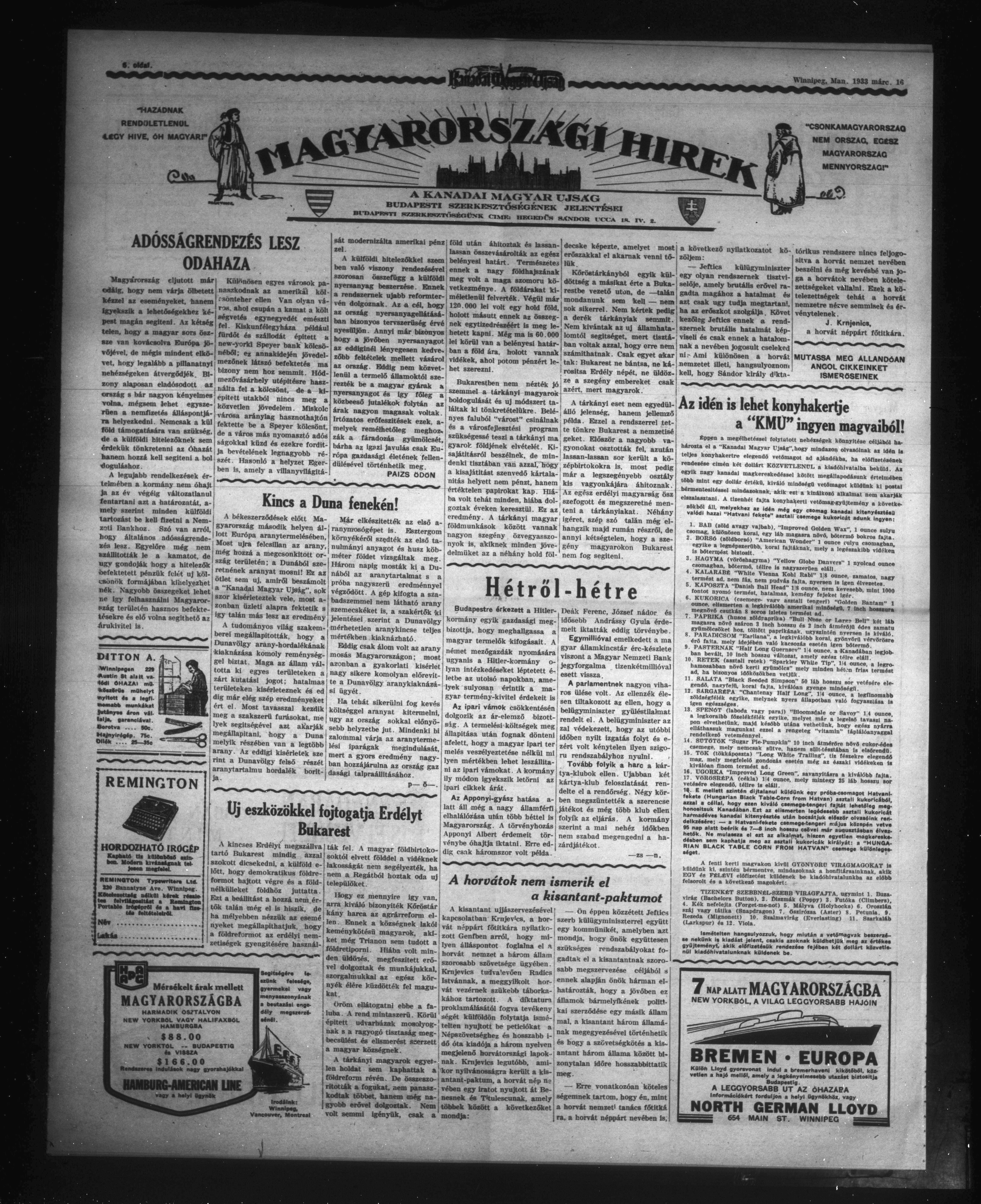 Kanadai Magyar Ujság : Vol. X. Evfolyam, No. 11. Szam. (1933 Március 16)