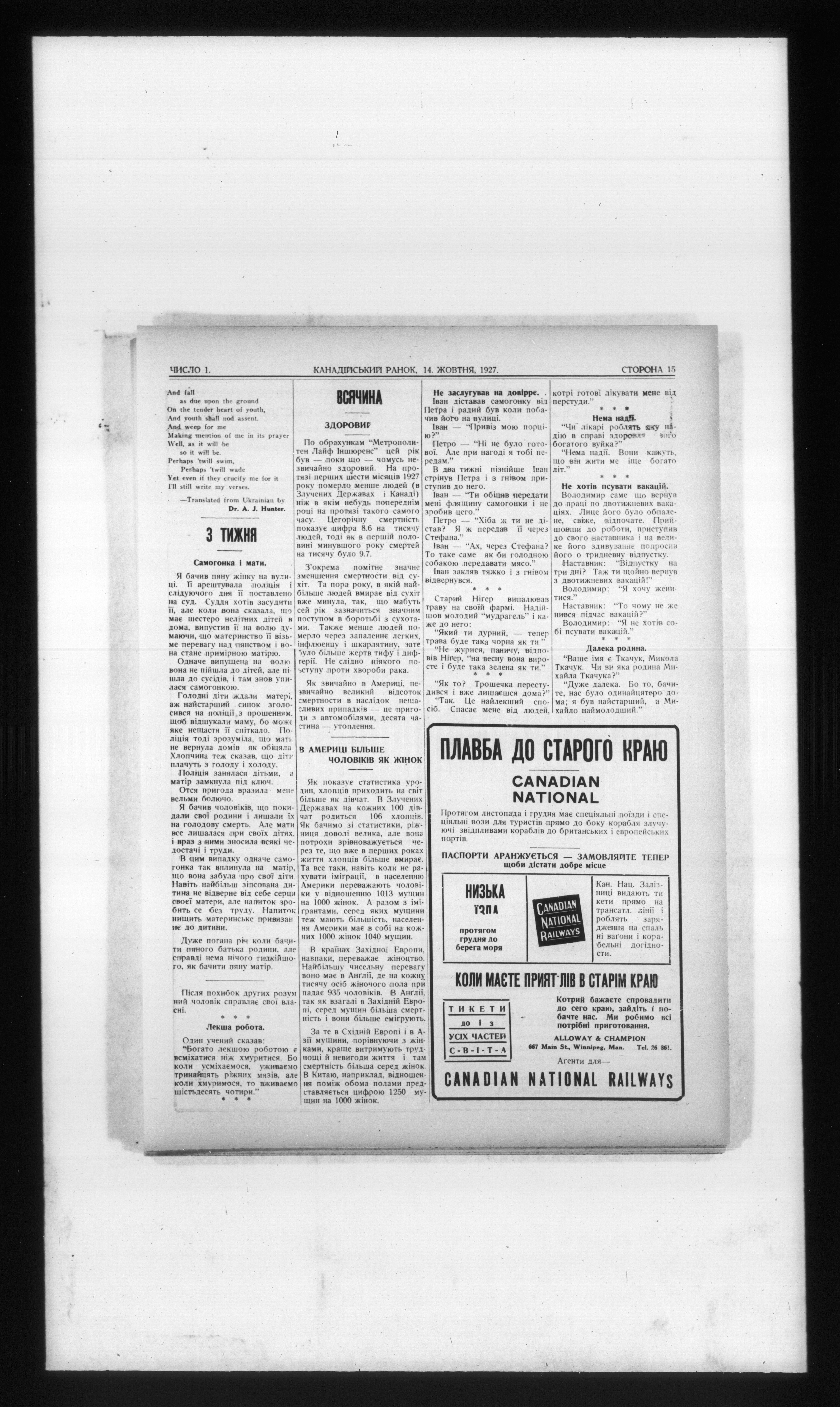 - Kanadiiskyi ranok = Canadian ranok : Chyslo 1, Rik XXII (14 Zhovtnia 1927) = Vol. XXII, No. 1 (October 14, 1927)