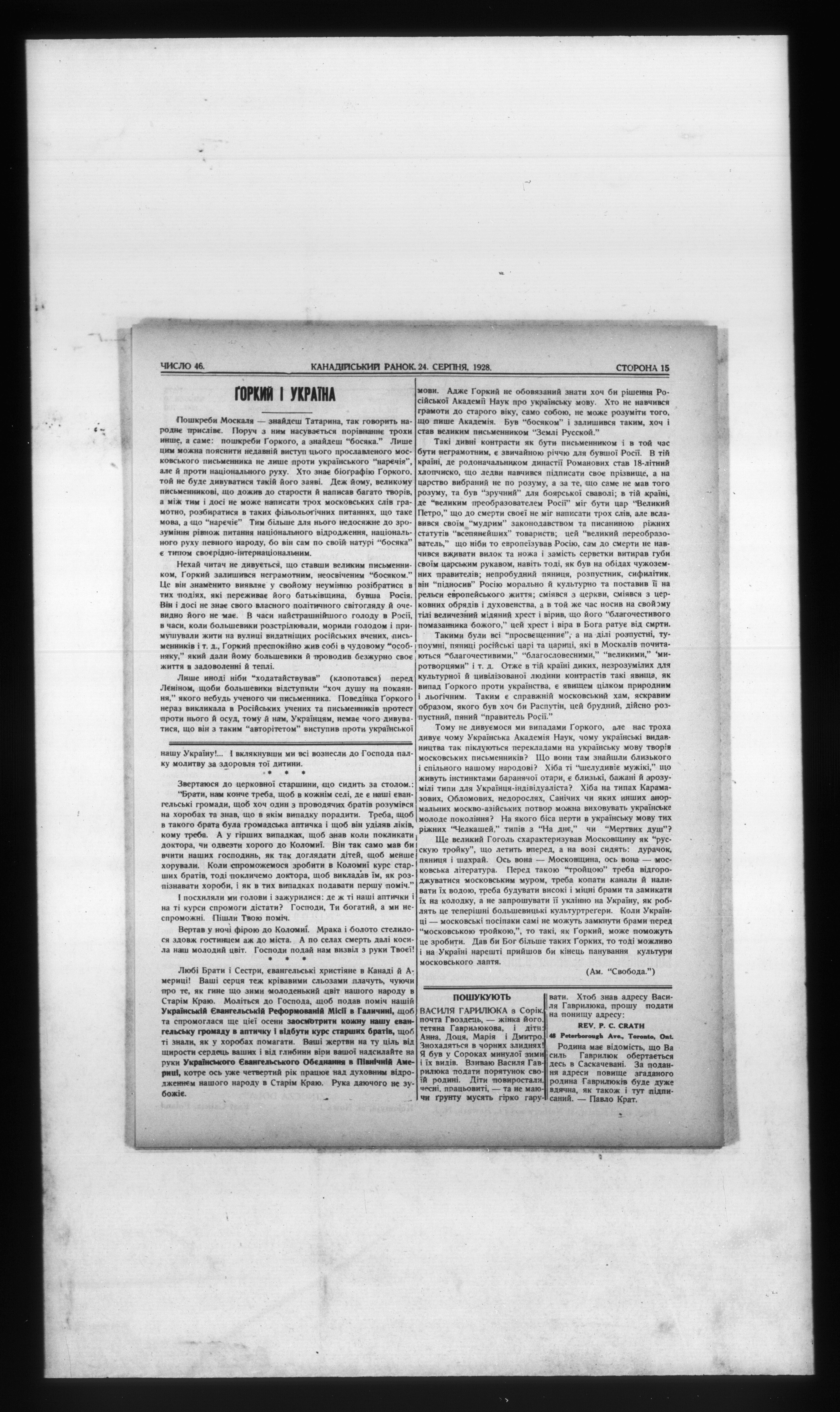 - Kanadiiskyi ranok = Canadian ranok : Chyslo 46, Rik XXIII (24 Serpnia 1928) = Vol. XXIII, No. 46 (August 24, 1928)