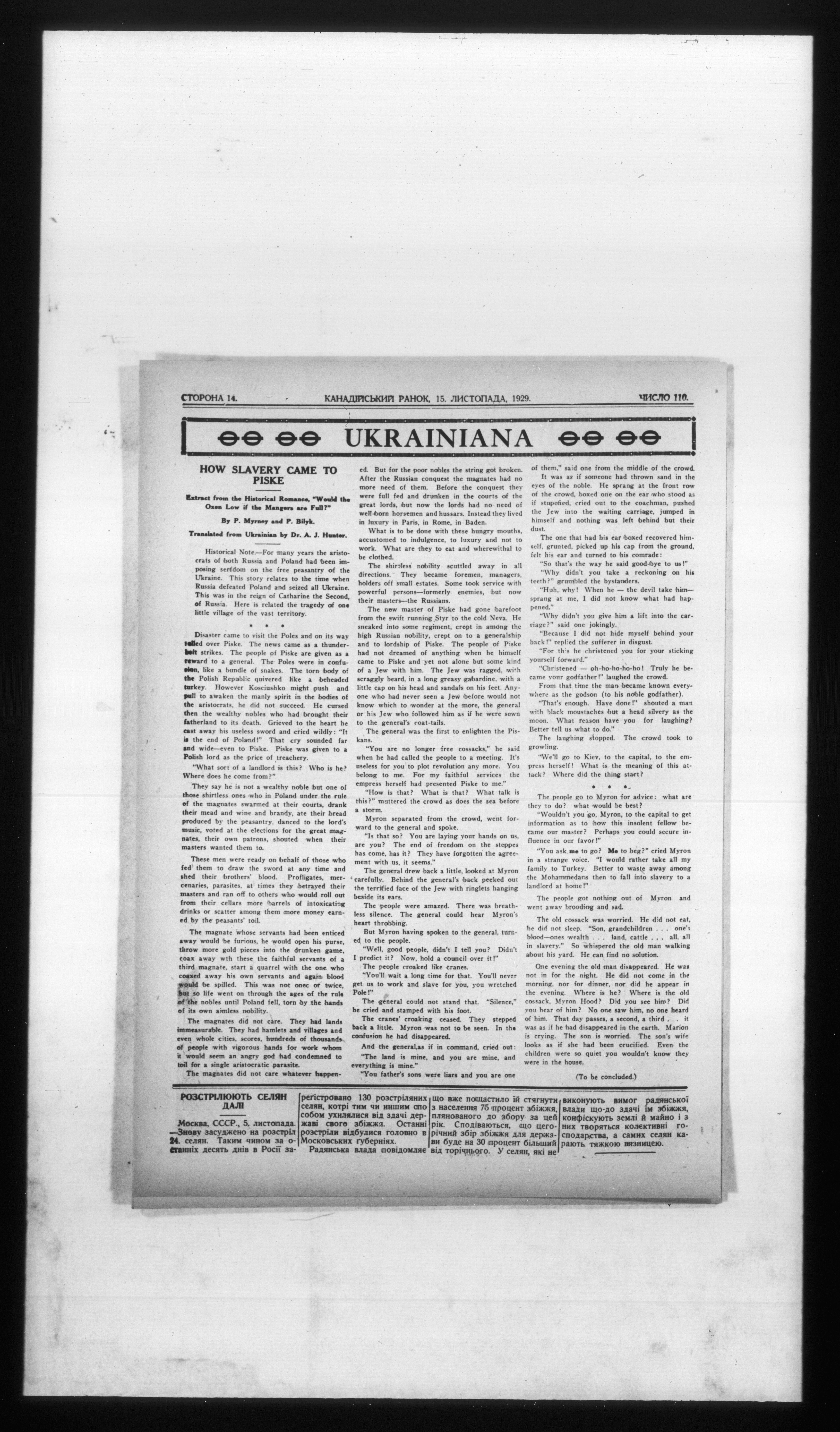 - Kanadiiskyi ranok = Canadian ranok : Chyslo 110, Rik XXIV (15 Lystopada 1929) = Vol. XXIV, No. 110 (November 15, 1929)
