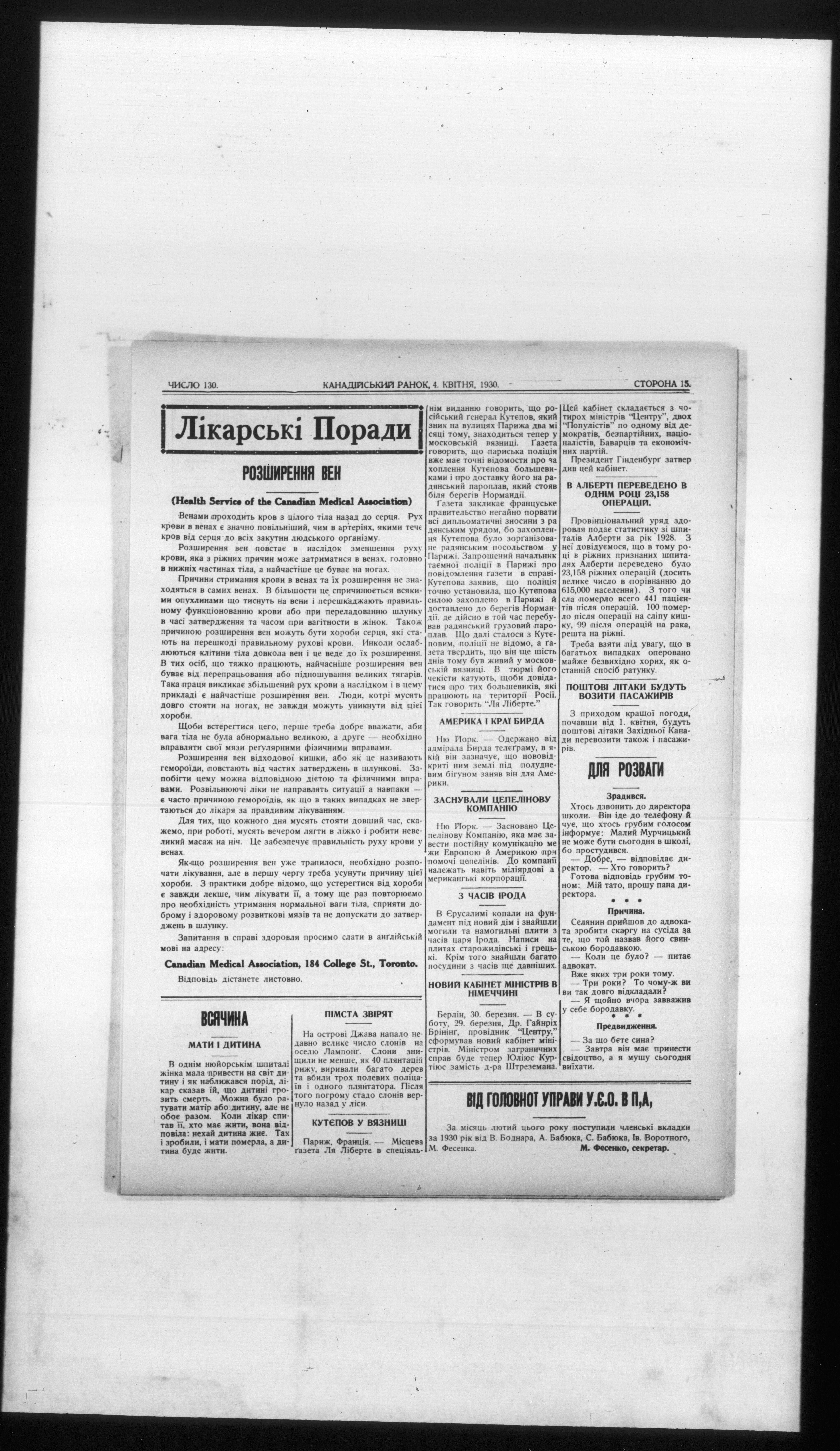 Kanadiiskyi ranok = : Kanadiiskyi ranok = Canadian ranok : Chyslo 130, Rik XXV (4 Kvitnia 1930) = Vol. XXV, No. 130 (April 4, 1930)