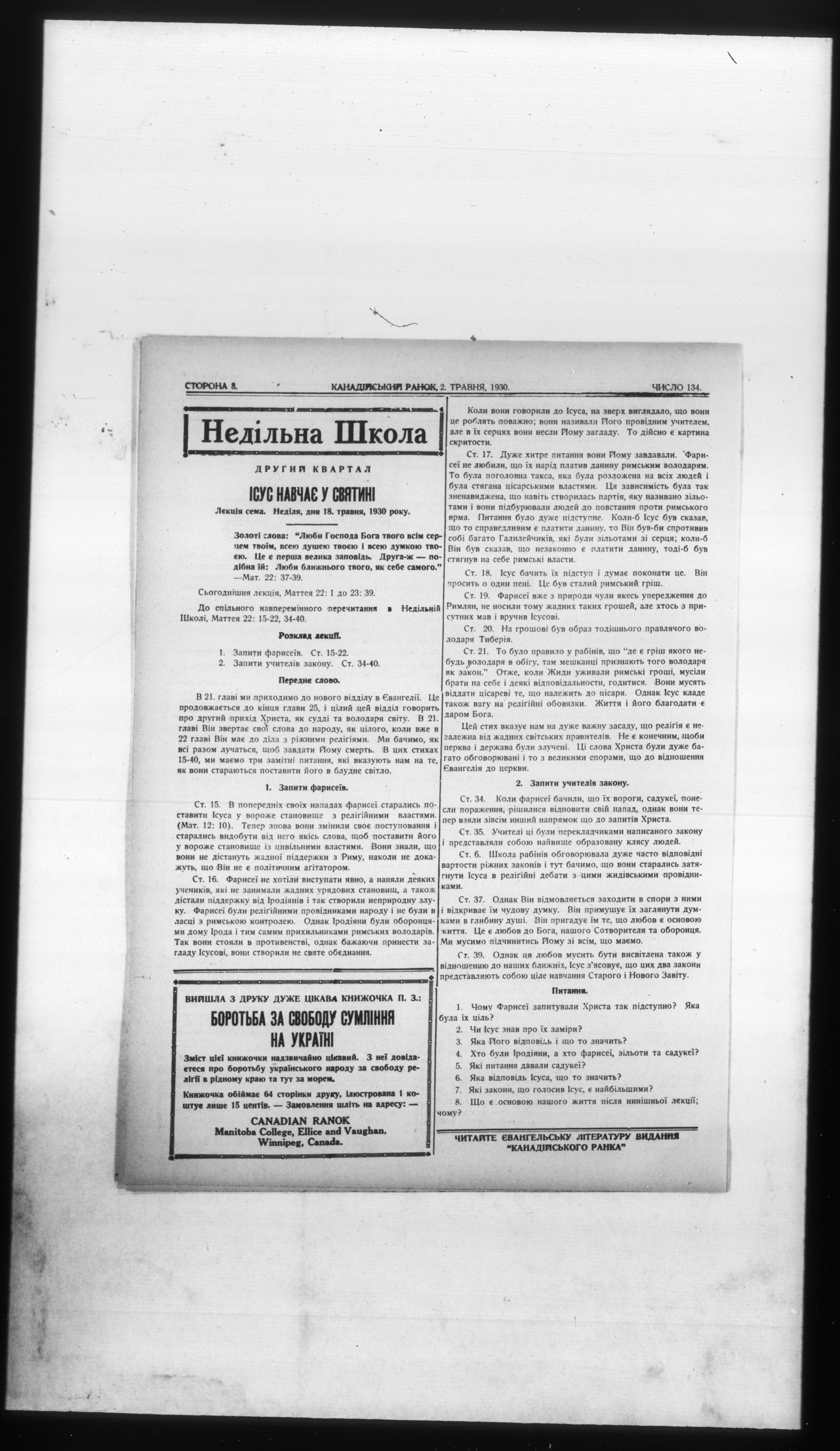 - Kanadiiskyi ranok = Canadian ranok : Chyslo 134, Rik XXV (2 Travnia 1930) = Vol. XXV, No. 134 (May 2, 1930)