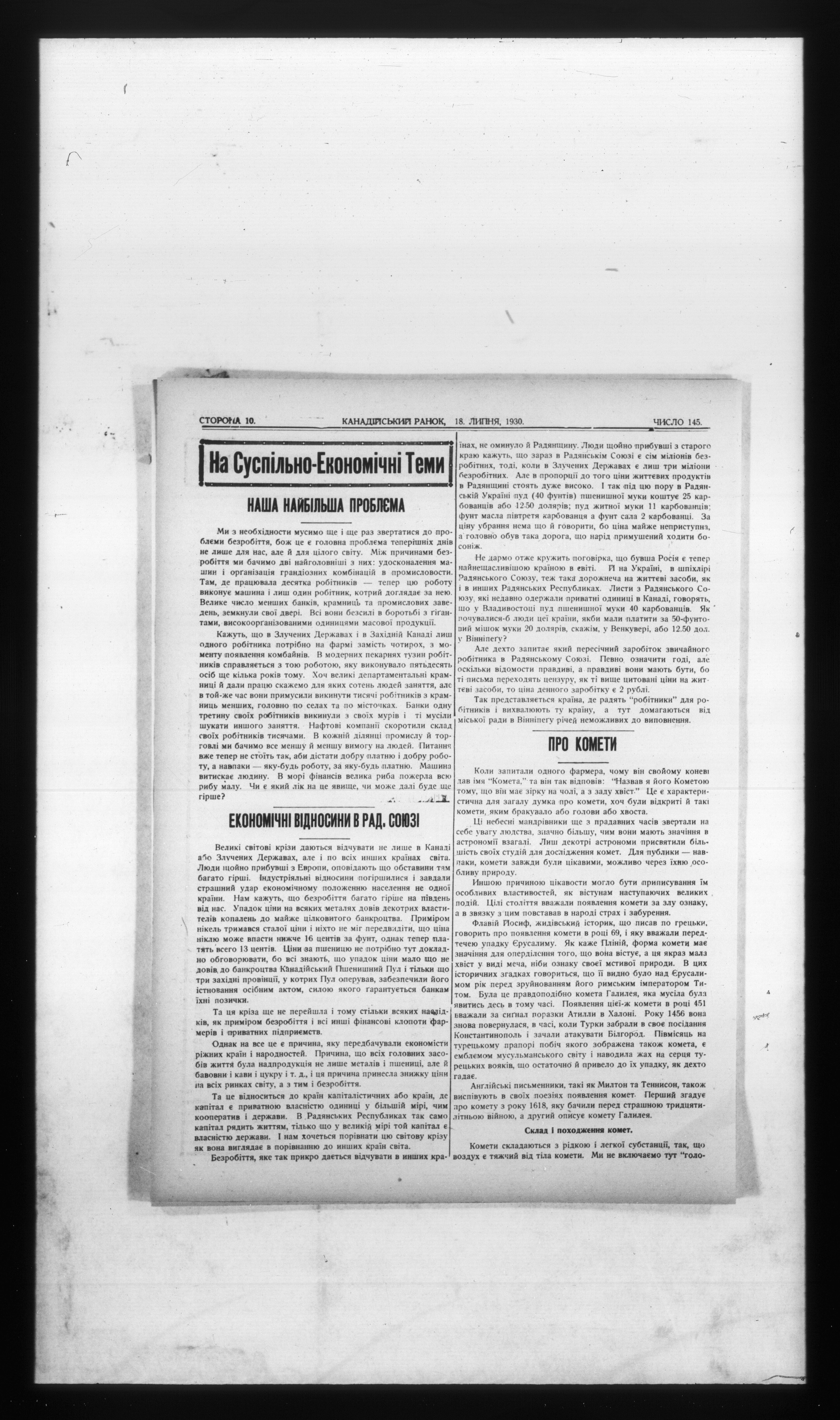 - Kanadiiskyi ranok = Canadian ranok : Chyslo 145, Rik XXV (18 Lypnia 1930) = Vol. XXV, No. 145 (July 18, 1930)