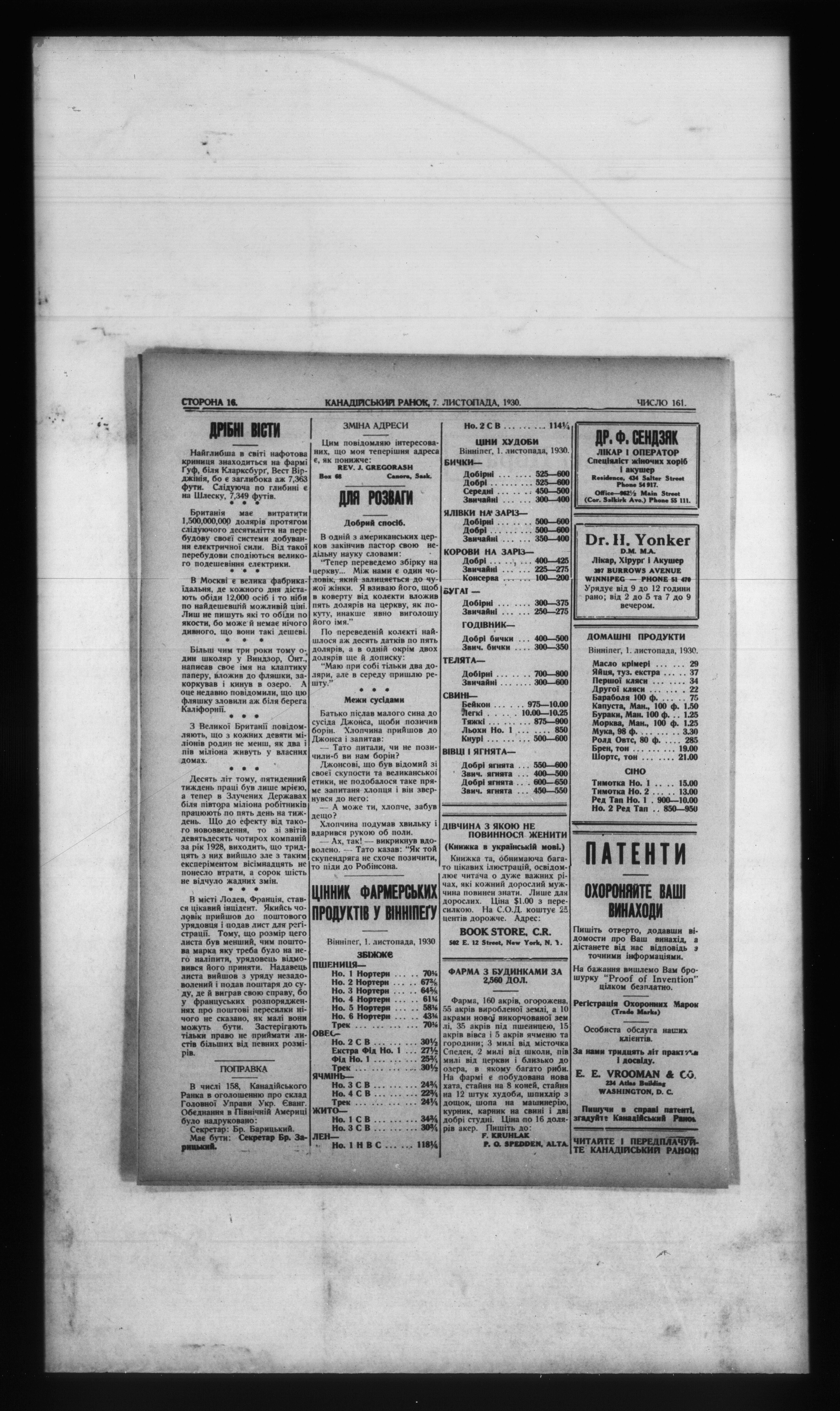 - Kanadiiskyi ranok = Canadian ranok : Chyslo 161, Rik XXV (7 Lystopada 1930) = Vol. XXV, No. 161 (November 14, 1930)