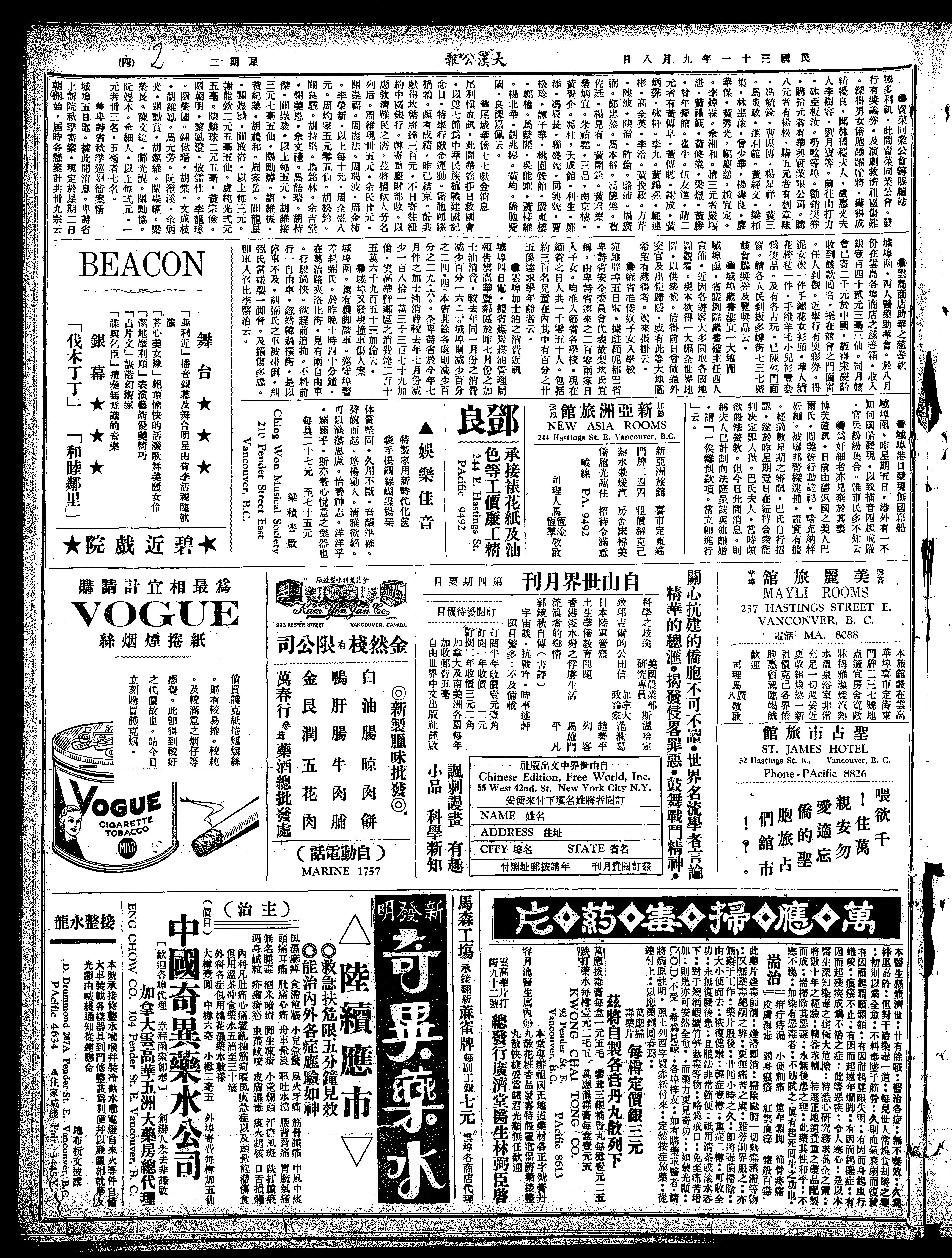 Vancouver, British Columbia : Tai Hon Kong Bo Ltd., 1942; 8 images with full-text search