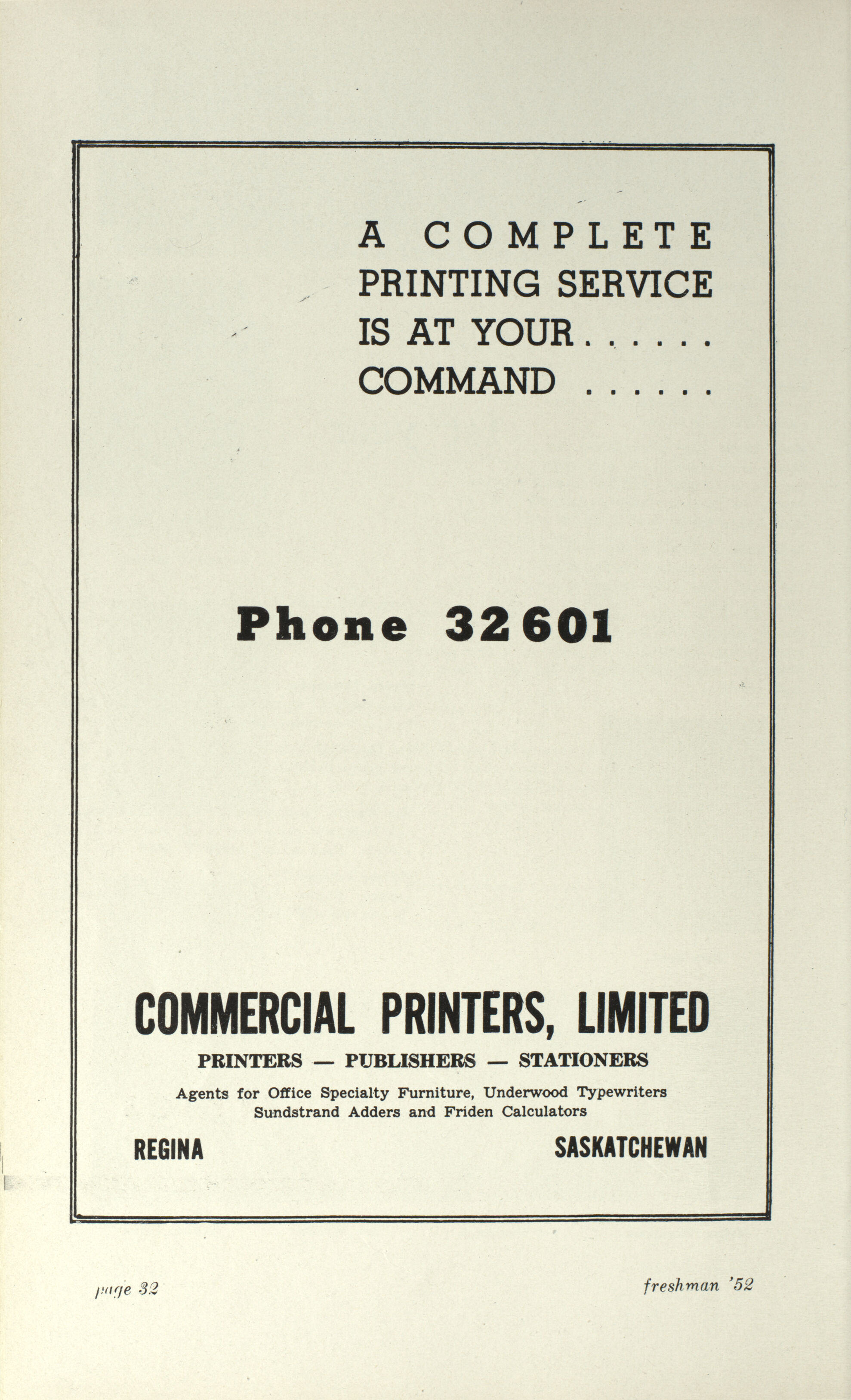 - Regina, Sask. : University of Saskatchewan, Regina College, 1952
