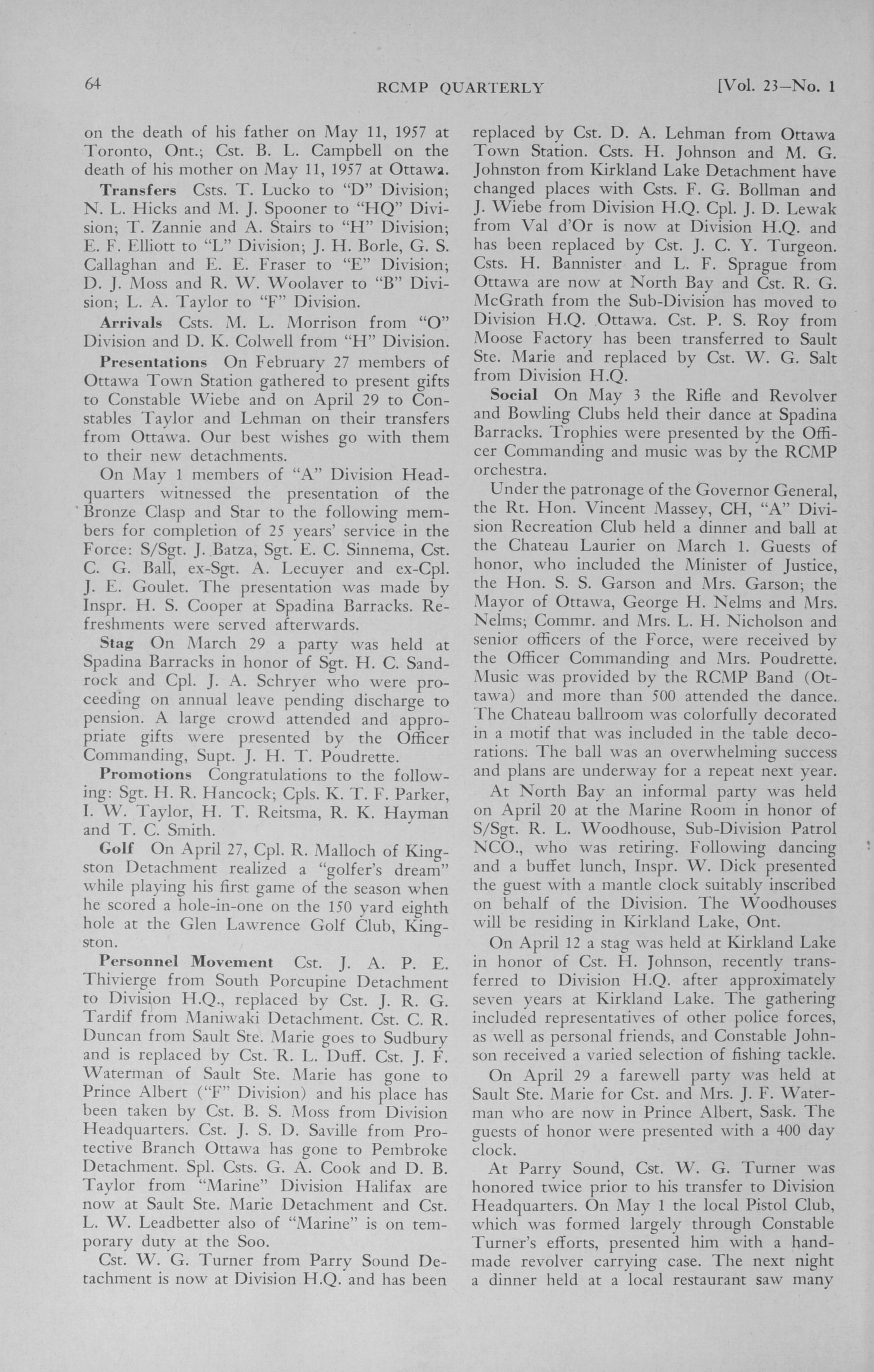 - Royal Canadian Mounted Police quarterly: Vol. 23, No. 1 (July, 1957)