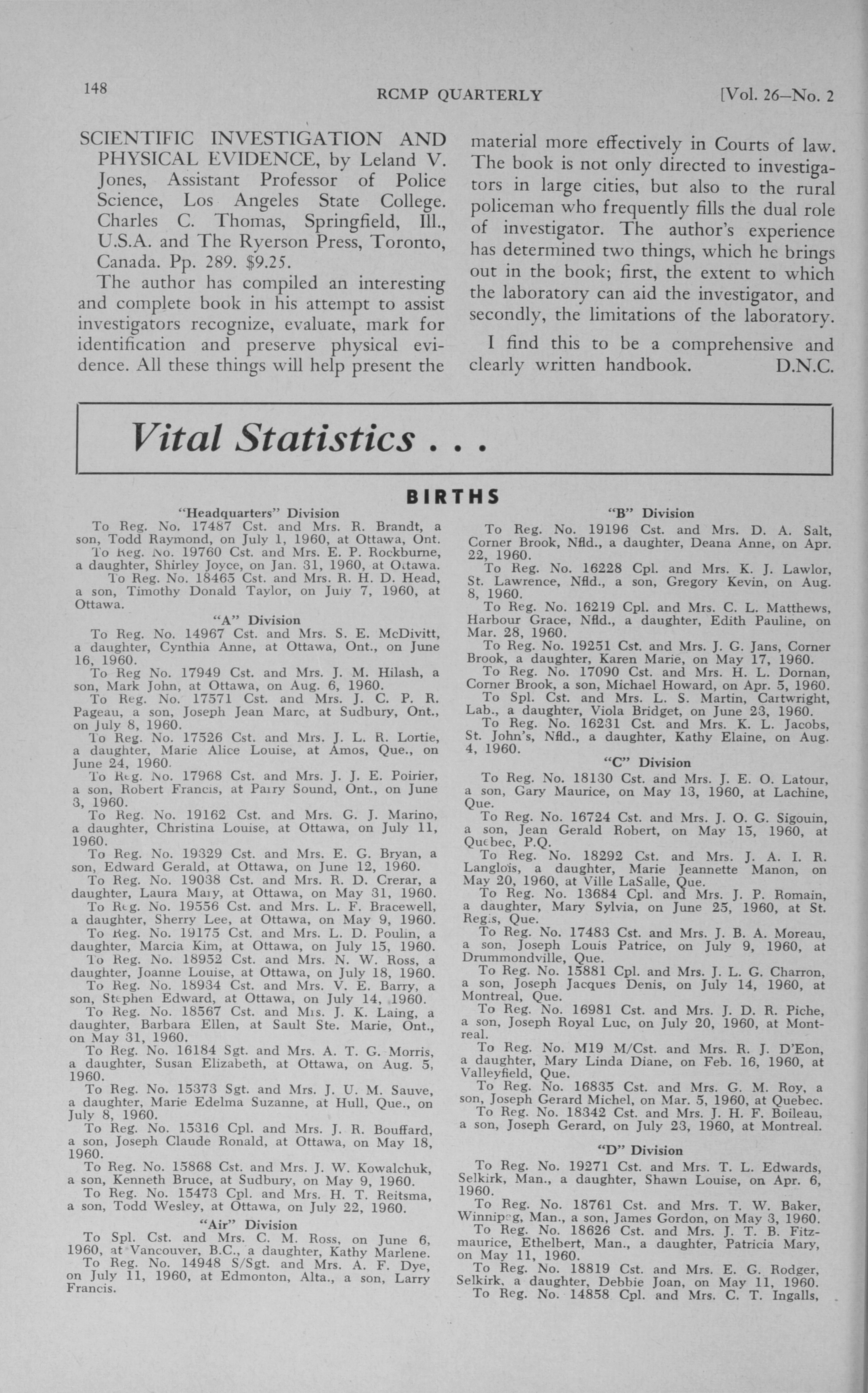 Royal Canadian Mounted Police quarterly. : Royal Canadian Mounted Police quarterly: Vol. 26, No. 2 (October, 1960)